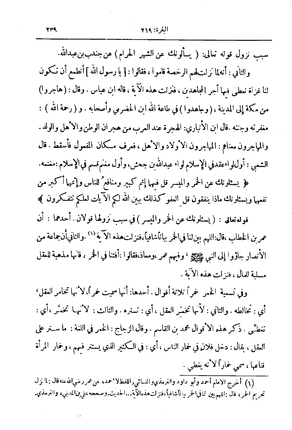 قوله تعالى يسئلونك عن الخمر والميسر في سبب نزولها قولان أحدهما أن عمر بن الخطاب قال اللهم بين لنا في الخمر بيانا شافيا فنزلت هذه الآية والثاني أن جماعة من الانصار جاؤوا إلى النبي صلى الله عليه و سلم وفيهم عمر ومعاذ فقالوا أفتنا في الخمر فإنها مذهبة للعقل مسلبة للمال فنزلت هذه الآية