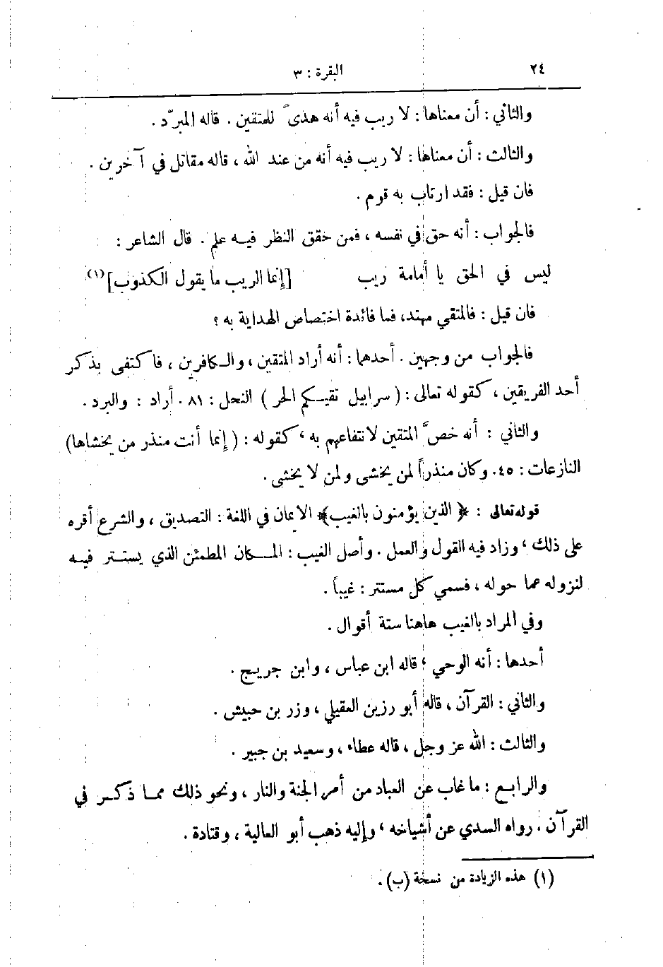 قوله تقالى الذين يؤمنون بالغيب الايمان في اللغة التصديق والشرع أقره على ذلك وزاد فيه القول والعمل وأصل الغيب المكان المطمئن الذي يستتر فيه لنزوله عما حوله فسمي كل مستتر غيبا