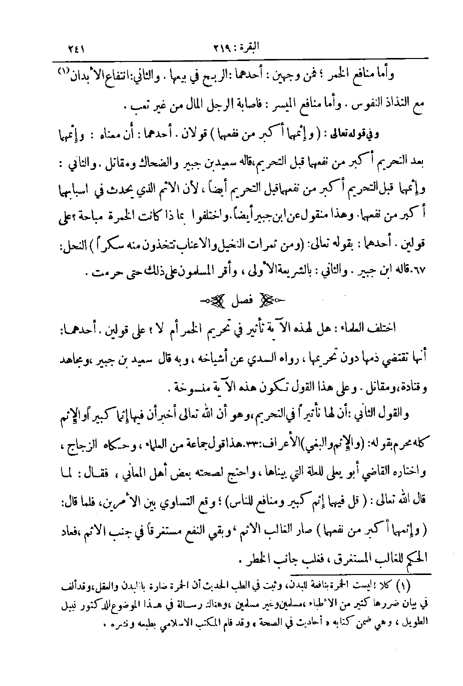 وفي قوله تعالى وإثمهما أكبر من نفعها قولان أحدهما أن معناه وإثمهما بعد التحريم أكبر من نفعهما قبل التحريم قاله سعيد بن جبير و الضحاك و مقاتل والثاني وإثمهما قبل التحريم أكبر من نفعهما قبل التحريم ايضا لأن الإثم الذي يحدث في اسبابها أكبر من نفعهما وهذا منقول عن ابن جبير ايضا واختلفوا بماذا كانت الخمرة مباحة على قولين أحدهما بقوله تعالى ومن ثمرات النخيل والأعناب تتخذون منه سكرا النحل 67 قاله ابن جبير والثاني بالشريعة الاولى وأقر المسلمون على ذلك حتى حرمت