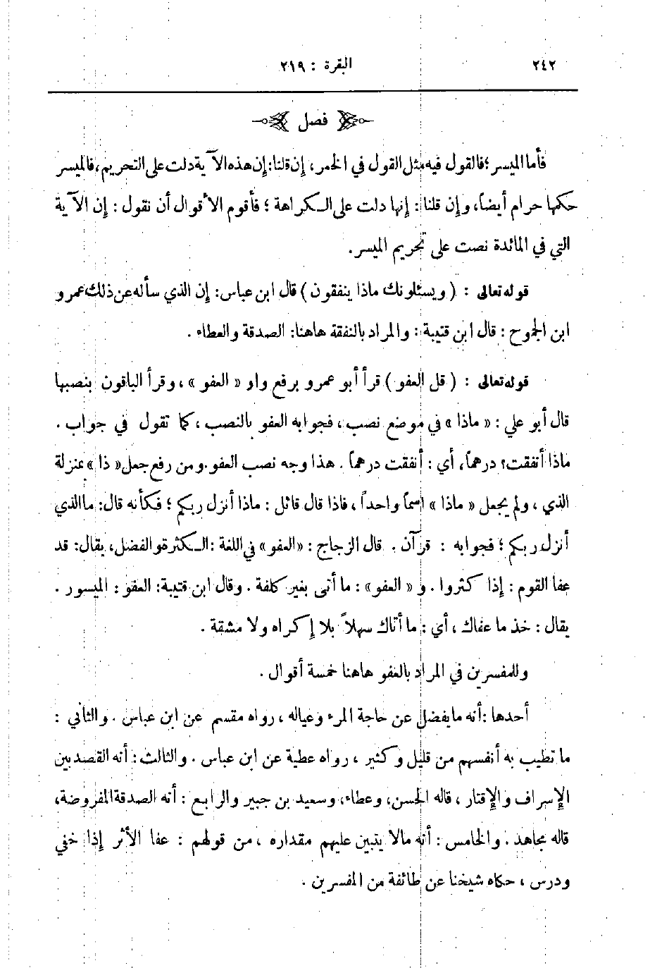 قوله تعالى قل العفو قرأ أبو عمرو برفع واو العفو وقرا الباقون بنصبها قال أبو علي ماذا في موضع نصب فجوابه العفو بالنصب كما تقول في جواب ماذا انفقت اى انفقت درهما هذا وجه نصب العفو ومن رفع جعل ذا بمنزلة الذي ولم يجعل ماذا اسما واحدا فاذا قال قائل ماذا أنزل ربكم فكانه قال ما الذي أنزل ربكم فجوابه قرآن قال الزجاج العفو في اللغة الكثرة والفضل يقال قد عفا القم إذا كثروا و العفو ما اتى بغير كلفة وقال ابن قتيبة العفو الميسور يقال خذ ما عفاك أي ما أتاك سهلا بلا إكراه ولا مشقة