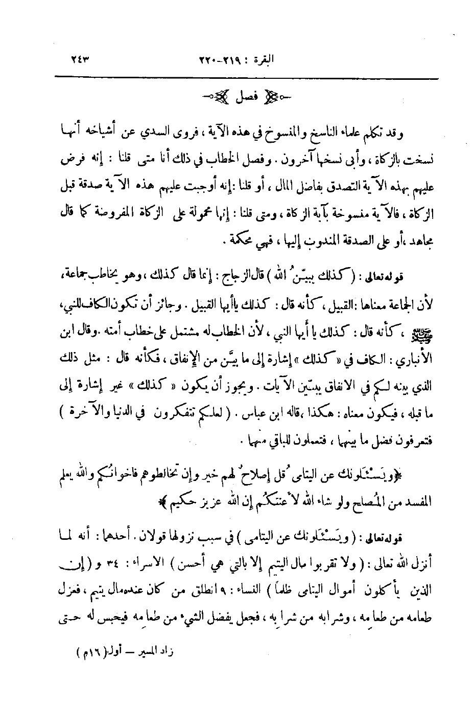 قوله تعالى كذلك يبين الله قال الزجاج إنما قال كذلك وهو يخاطب جماعة لأن الجماعة معناها القبيل كأنه قال كذلك يا أيها القبيل وجائز أن تكون الكفا للنبي صلى الله عليه و سلم كأنه قال كذلك يا أيها النبي لأن الخطاب له مشتمل على خطاب أمته وقال ابن الأنباري الكاف في كذلك إشارة إلى ما بين من الإنفاق فكأنه قال مثل ذلك الذي بينه لكم في الانفاق يبين الآيات ويجوز أن يكون كذلك غير إشارة إلى ما قبله فيكون معناه هكذا قاله ابن عباس لعلكم تتفكرون في الدنيا والآخرة فتعرفون فضل ما بينهما فتعملون للباقي منهما