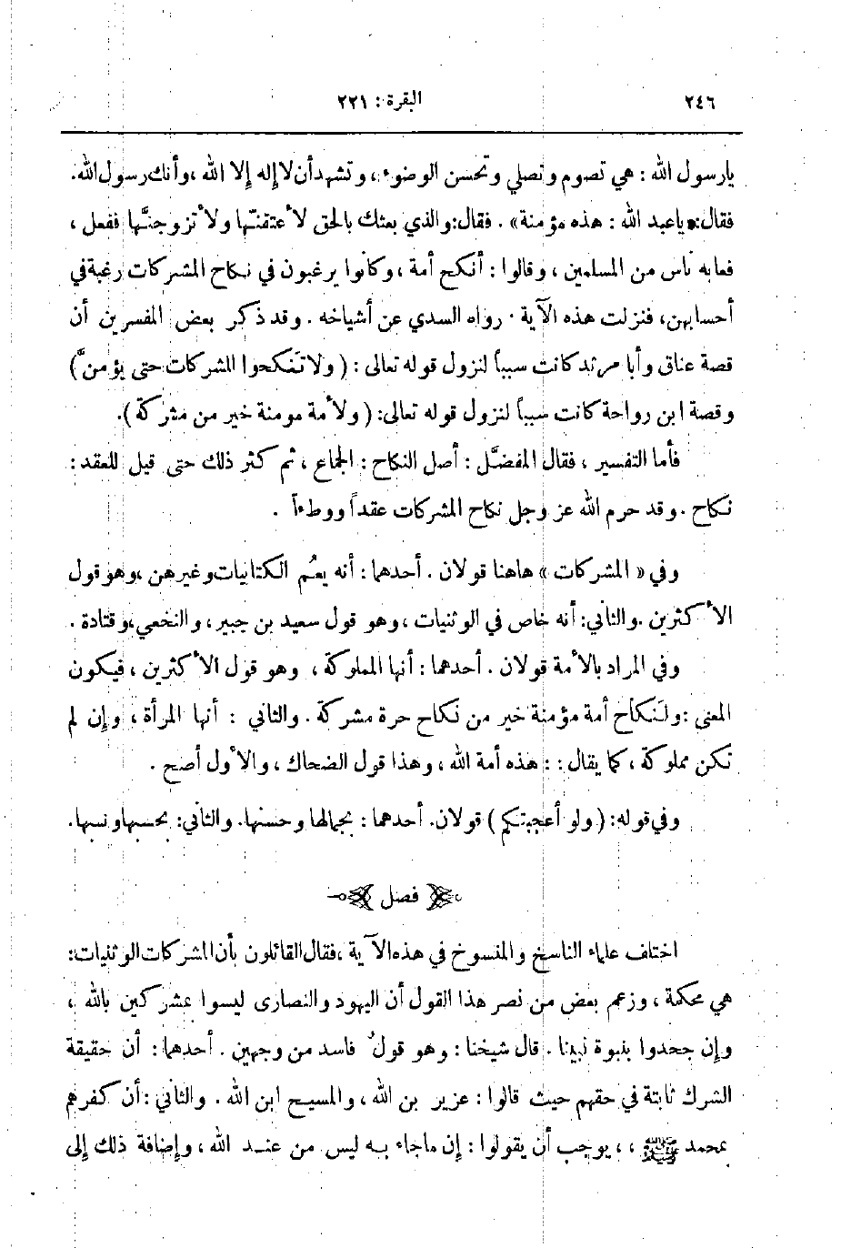 اختلف علماء الناسخ والمنسوخ في هذه الآية فقال القائلون بأن المشركات الوثنيات هي محكمة وزعم بعض من نصر هذا القول أن اليهود والنصارى ليسوا بمشركين بالله وإن حجدوا بنبوة نبينا قال شيخنا وهو قول فاسد من وجهين أحدهما أن حقيقة الشرك ثابتة في حقهم حيث قالوا عزير ابن الله والمسيح ابن الله والثاني أن كفرهم بمحمد صلى الله عليه و سلم يوجب أن يقولوا إن ما جاء به ليس من عند اله وإضافة ذلك إلى