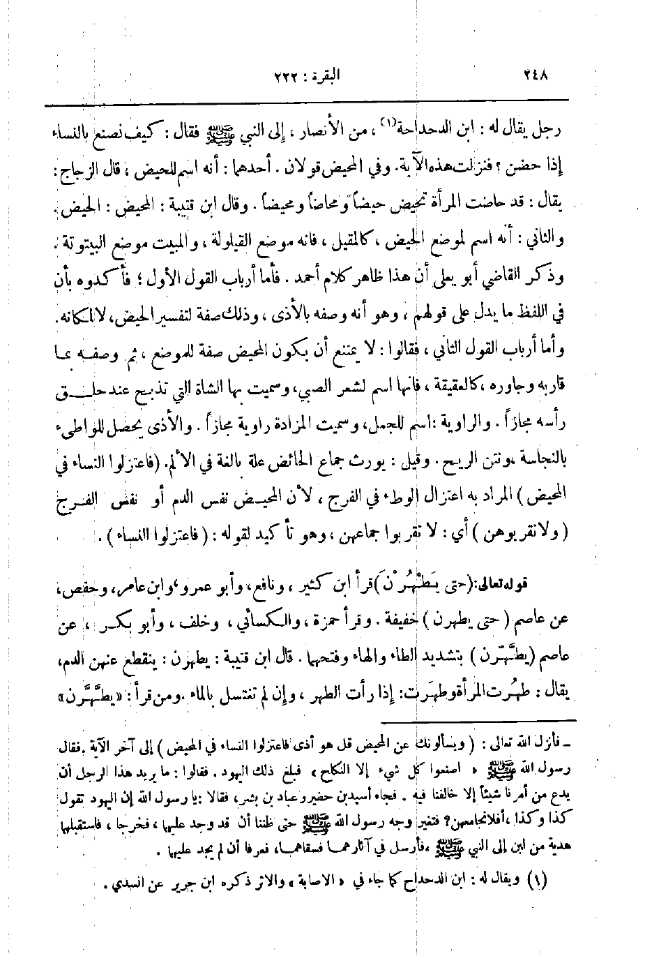 رجل يقال له ابن الدحداحة من الأنصار إلى النبي صلى الله عليه و سلم فقال كيف نصنع بالنساء إذا حضن فنزلت هذه الآية وفي المحيض قولان أحدهما أنه اسم للحيض قال الزجاج يقال قد حاضت المرأة تحيض حيضا ومحاضا ومحيضا وقال ابن قتيبة المحيض الحيض والثاني أنه اسم لموضع الحيض كالمقيل فانه موضع القيلولة والمبيت موضع البيتوتة وذكر القاضي أبويعلى أن هذاظاهر كلام أحمد فأما أرباب القول الأول فأكدوه بإن في اللفظ ما يدل على قولهم وهو أنه وصفه بالأذى وذلك صفة لتفسير الحيض لا لمكانه واما أرباب القول الثاني فقالوا لا يمتنع أن يكون المحيض صفة للموضع ثم وصفه بما قاربه وجاوره كالعقيقة فإنها اسم لشعر الصبي وسميت بها الشاة التي تذبح عند حلق رأسه مجازا والرواية اسم للجمل وسميت المزادة راوية مجازا والأذى يحصل للواطىء بالنجاسة ونتن الريح وقيل يورث جماع الحائض علة بالغة في الألم فاعتزلوا النساء في المحيض المراد به اعتزال الوطء في الفرج لأن المحيض نفس الدم أو نفس الفرج ولا تقربوهن أي لا تقربوا جماعهن وهو تأكيد لقوله فاعتزلوا النساء