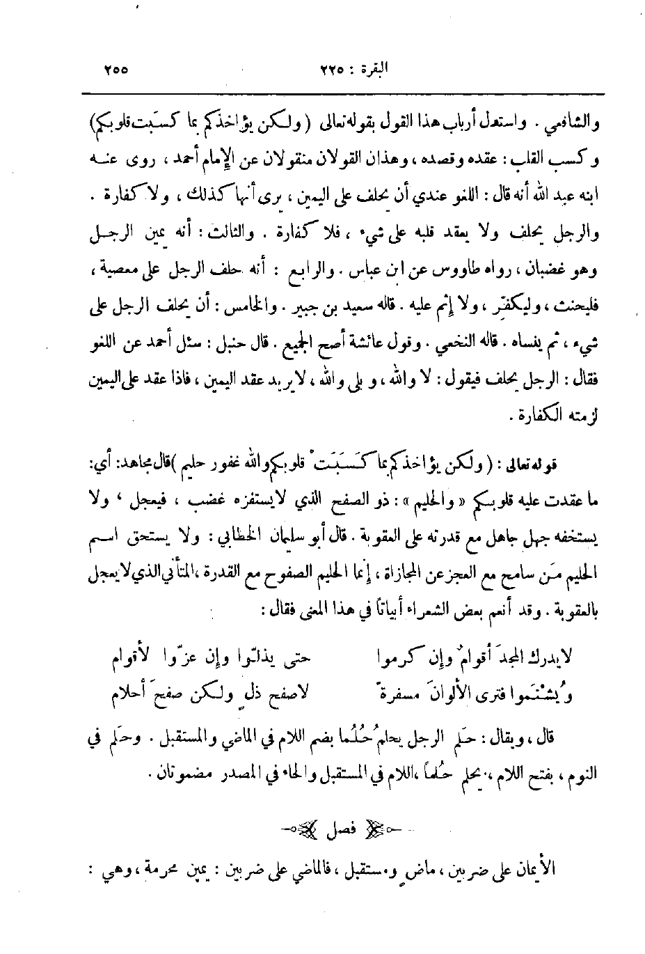 قوله تعالى ولكن يؤاخذكم بما كسبت قلبوكم والله غفور حليم قال مجاهد أي ما عقدت عليه قلوبكم والحليم ذو الصفح الذي لا يستفزه غضب فيعجل و يستخفه جهل جاهل مع قدرته على العقوبة قال أبو سليمان الخطابي ولا يستحق اسم الحليم من سامح مع العجز عن المجازاة إنما الحليم الصفوح مع القدرة المتأني الذي لا يعجل بالعقوبة وقد أنعم بعض الشعراء أبياتا في هذا المعنى فقال ... لا يدرك المجد أقوام و إن كرموا ... حتى يذلوا وإن عزوا لأقوام ... ويشتموا فترى الألوان مسفرة ... لا صفح ذل ولكن صفح أحلام ...