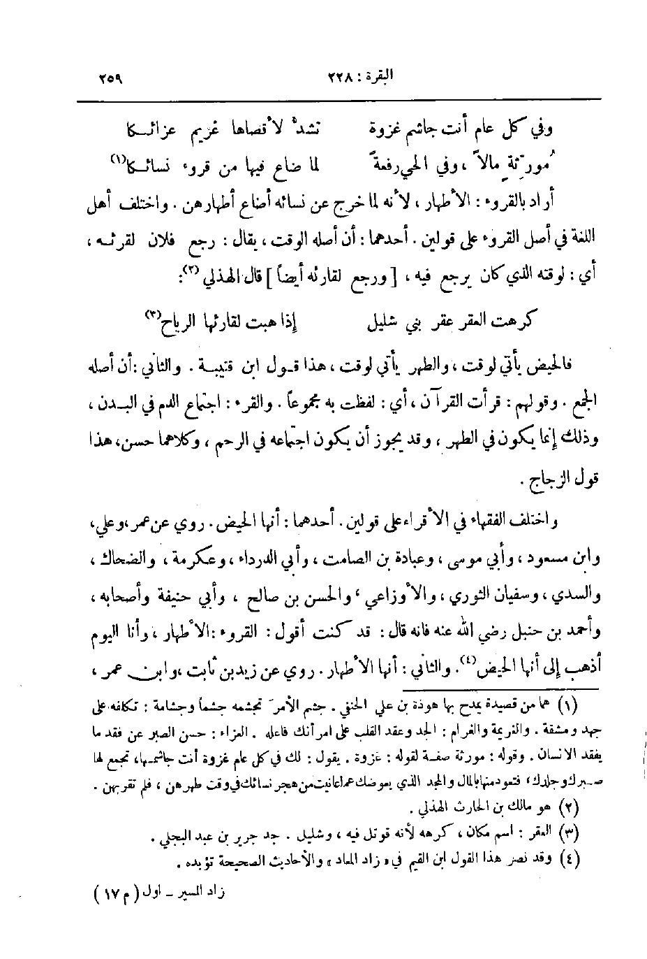واختلف الفقهاء في الأقراء على قولين أحدهما أنها الحيض روي عن عمر وعلي وابن مسعود و أبي موسى وعبادة بن الصامت و أبي الدرداء وعكرمة و الضحاك والسدي و سفيان الثوري والأوزاعي والحسن بن صالح و أبي حنيفة و أصحابه و أحمد بن حنبل رضي الله عنه فانه قال قد كنت أقول القروء الأطهار وأنا اليوم أذهب إلى أنها الحيض والثاني أنها الأطهار روي عن زيد بن ثابت وابن عمر