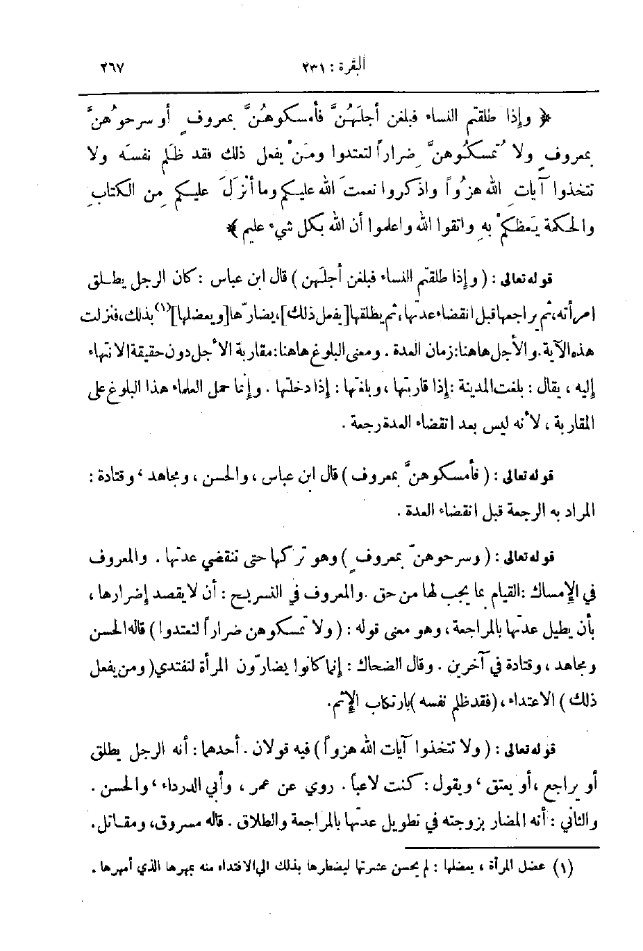 و إذا طلقتم النساء فبلغن أجلهن فأمسكوهن بمعروف أو سرحوهن بمعروف ولا تمسكوهن ضرارا لتعدتدوا ومن يفعل ذلك فقد ظلم نفسه ولا تتخذوا آيات الله هزوا واذكروا نعمت الله عليكم وما أنزل عليكم من الكتاب والحكمة يعظكم به واتقوا الله واعلموا أن الله بكل شيء عليم
