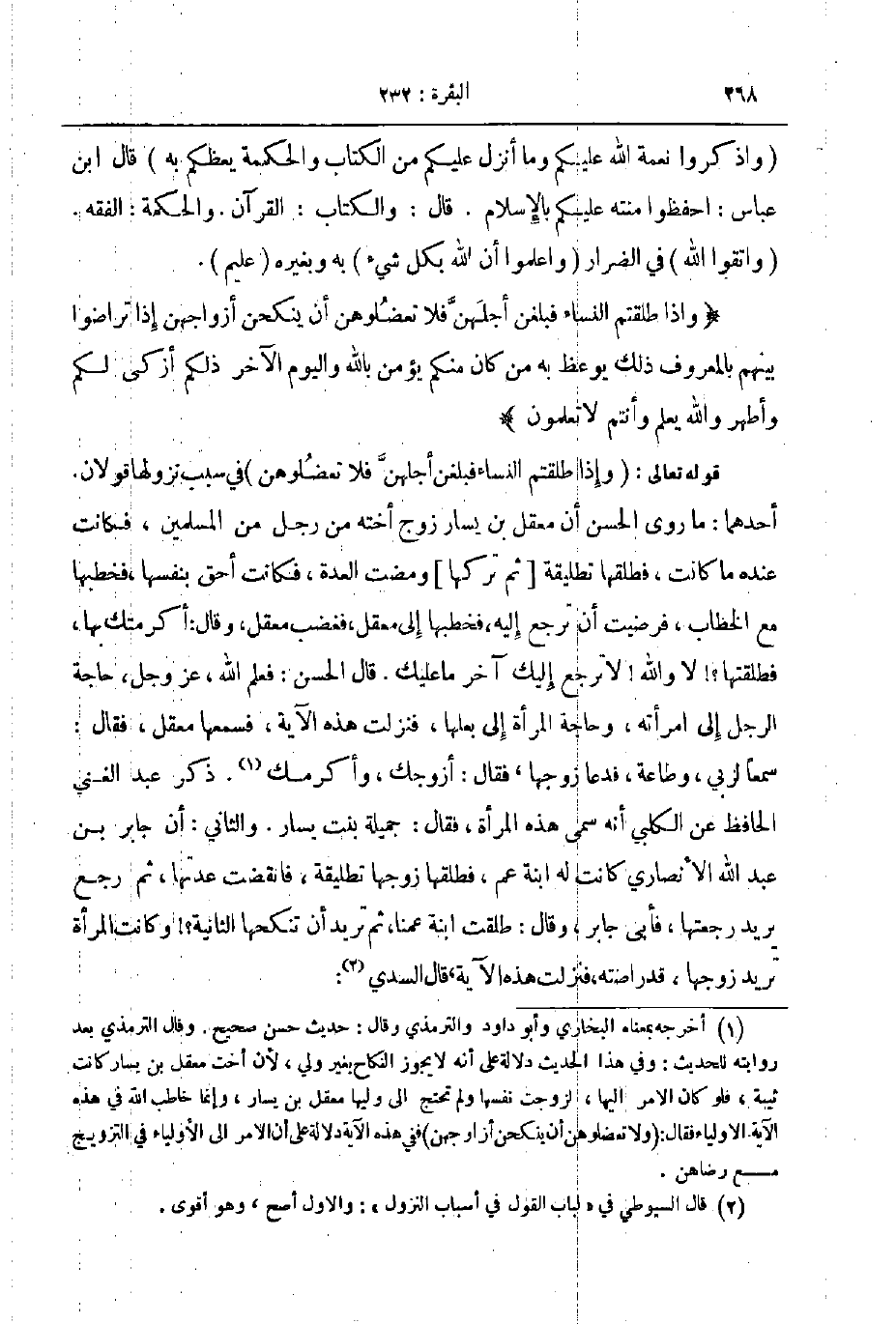 قوله تعالى و إذا طلقتم النساء فبلغن أجلهن فلا تعضلوهن في سبب نزولها قولان أحدهما ما روى الحسن أن معقل بن يسار زوج اخته من رجل من المسلمين فكانت عنده ما كانت فطلقها تطليقة ثم تركها ومضت العدة فكانت أحق بنفسها فخطبها مع الخطاب فرضيت أن ترجع إليه فخطبها إلى معقل فغضب معقل وقال أكرمتك بها فطلقتها لا والله لا ترجع إليك آخر ما عليك قال الحسن فعلم الله عز و جل حاجة الرجل إلى امرأته وحاجة المرأة إلى بعلها فنزلت هذه الآية فسمعها معقل فقال سمعا لربي وطاعة فدعا زوجها فقال أزوجك وأكرمك ذكر عبد الغني الحافظ عن الكلبي أنه سمى هذه المرأة فقال جميلة بنت يسار والثاني أن جابر بن عبد الله الأنصاري كانت له ابنة عم فطلقها زوجها تطليقة فانقضت عدتها ثم رجع يريد رجعتها فأبى جابر وقال طلقت ابنة عمنا ثم تريد أن تنكحها الثانية وكانت المرأة تريد زوجها قد راضته فنزلت هذه الآية قال السدي