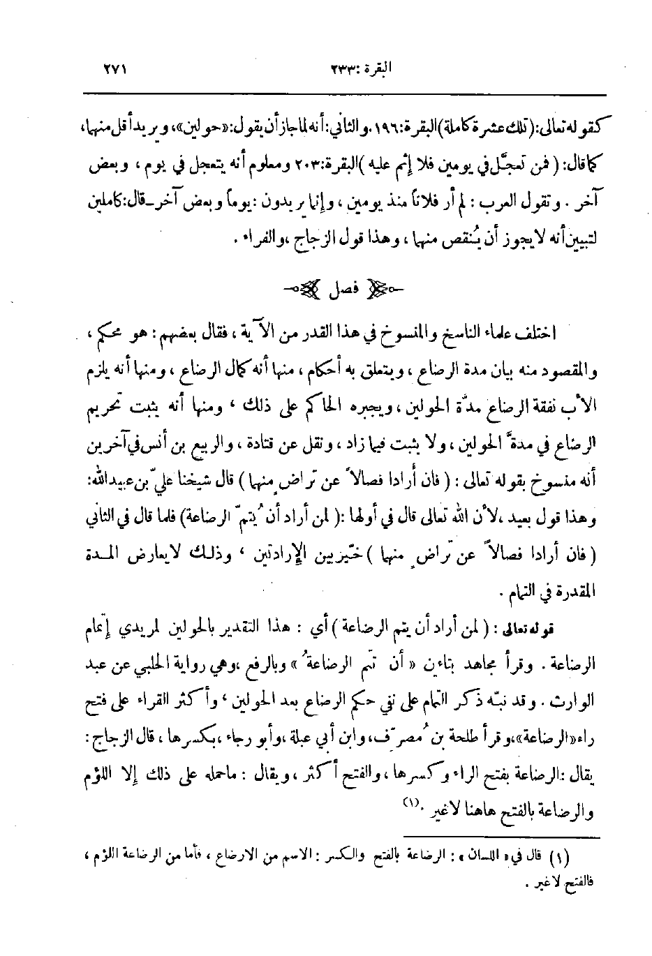 واختلف علماء الناسخ والمنسوخ في هذا القدر من الآية فقال بعضهم هو محكم والمقصود منه بيان مدة الرضاع ويتعلق به أحكام منها أنه كمال الرضاع ومنها أنه يلزم الأب نفقة الرضاع مدة الحولين والجبره الحاكم على ذلك ومنها أنه يثتب تحريم الرضاع في مدة الحولين ولا يثبت فيما زاد ونقل عن قتادة والربيع بن أنس في آخرين أنه منسوخ بقوله تعالى فان أرادا فصالا عن تراض منهما قال شيخنا علي بن عبيد الله وهذا قول بعيد لأن الله تعالى قال في اولها لمن أراد أن يتم الرضاعة فلما قال في الثاني فان أرادا فصالا عن تراض منهما خير يين الإرادتين وذلك لا يعاض المدة المقدرة في التمام