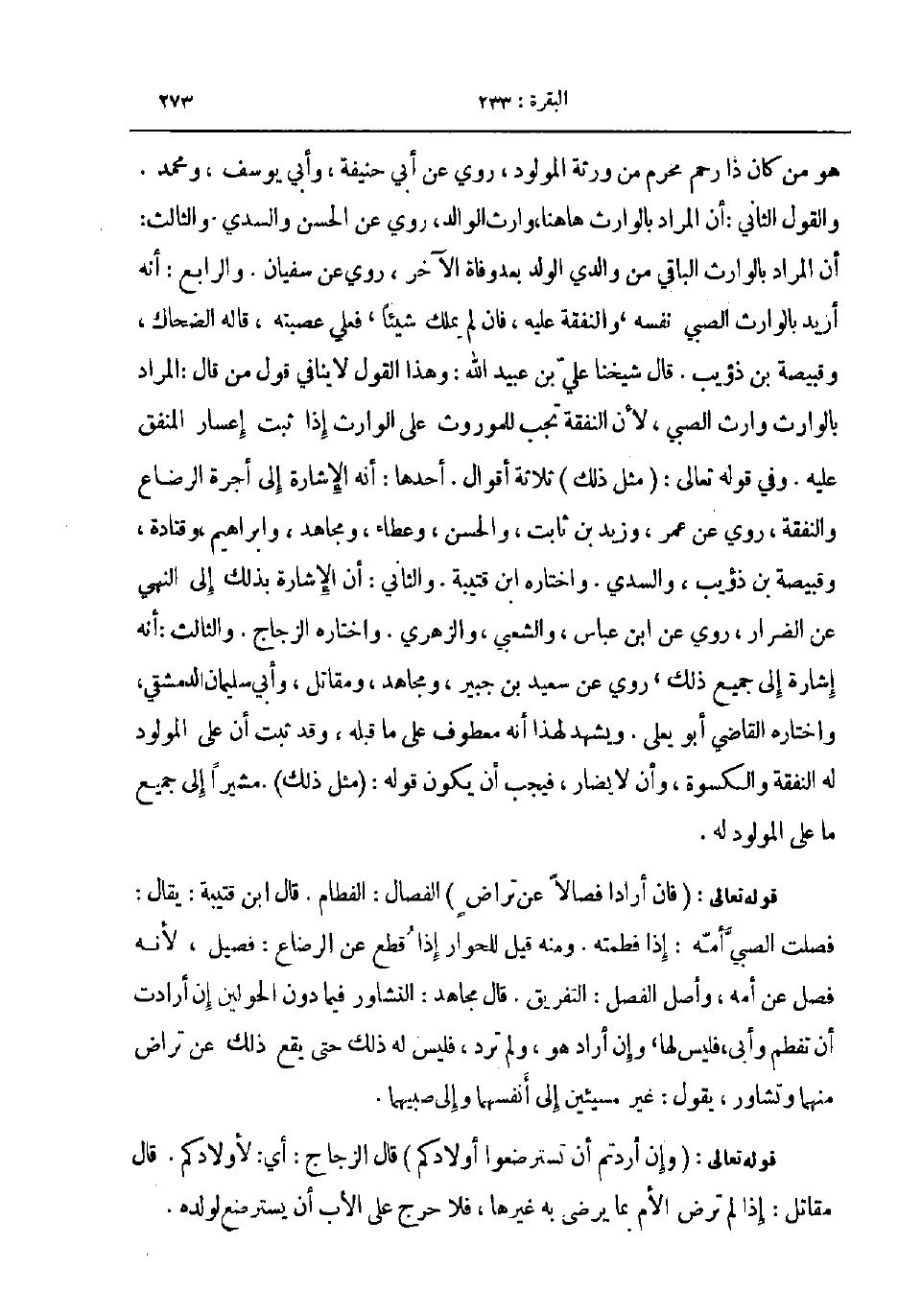قوله تعالى فان أرادا فصالا عن تراض الفصال الفطام قال ابن قتيبة يقال فصلت الصبي أمه إذا فطمته ومنه قيل للحوار إذا قطع عن الرضاع فصيل لأنه فصل عن امه وأصل الفصل التفريق قال مجاهد التشاور فيما دون الحولين إن أرادت أن تفطم وأبى فليس لها و إن أراد هو ولم ترد فليس له ذلك حتى يقع ذلك عن تراض منهما وتشاور يقول غير مسيئين إلى أنفسهما و إلى صبيهما