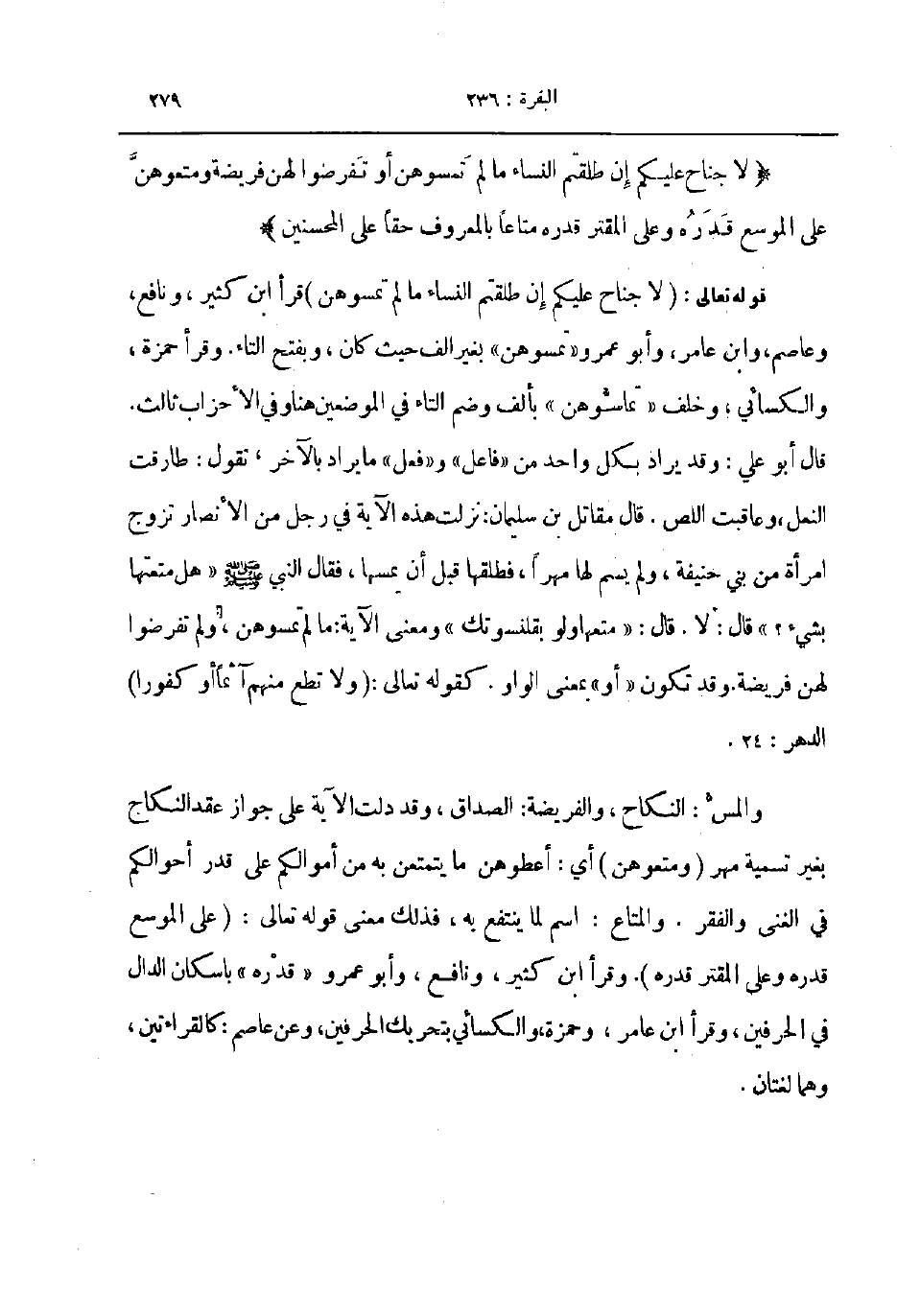 قوله تعالى لا جناح عليكم إن طلقتم النساء ما لم تمسوهن قرأ ابن كثير ونافع وعاصم وابن عامر و أبو عمرو تمسوهن بغير الف حيث كان وبفتح التاء وقرأ حمزة والكسائي وخلف تماسوهن بألف وضم التاء في الموضعين هنا وفي الأحزاب ثالث قال أبو علي وقد يراد بكل واحد من فاعل وفعل ما يراد بالآخر نقول طارقت النعل وعاقبت اللص قال مقاتل بن سليمان نزلت هذه الآية في رجل من الأنصار تزوج امرأة من بني حنيفة ولم يسم لها مهرا فطلقها قبل أن يسمها فقال النبي صلى الله عليه و سلم هل متعتها بشيء قال لا قال متعها ولو بقلنسوتك ومعنى الآية ما لم تمسوهن ولم تفرضوا لهن فريضة وقد تكون أو بمعنى الواو كقوله تعالى ولا تطع منهم آثما أو كفورا الدهر 24
