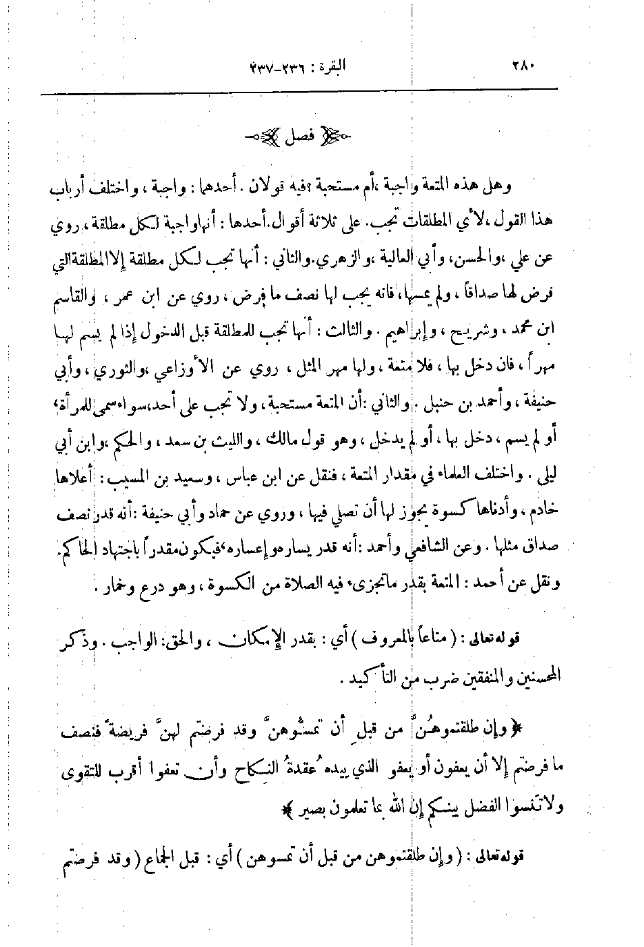 وهل هذه المتعة واجبة أم مستحبة فيه قلان أحدهما واجبة واختلف أرباب هذا القول لأي المطلقات تجب على ثلاثة اقوال أحدها أنها واجبة لكل مطلقة روي عن علي والحسن و أبوالعالية والزهري والثاني انها تجب لكل مطلقة إلا المطقلة التي فرض لها صداقا ولم يمسها فإنه يجب لها نصف ما فرض روي عن ابن عمر والقاسم ابن محمد وشريح و إبراهيم والثالث أنها تجب للمطلقة قبل الدخول إذا لم يسم لها مهرا فان دخل بها فلا متعة ولها مهر المثل روي عن الأوزاعي والثوري وأبي حنيفة و أحمد بن حنبل والثاني أن المتعة مستحبة ولا تجب على احد سواء سمي للمرأة أو لم يسم دخل بها أو لم يدخل وهو قول مالك والليث بن سعد والحكم وابن أبي ليلى واختلف العلماء في مقدار المتعة فنقل عن ابن عباس وسعيد بن المسيب أعلاها خادم وأدناها كسوة يجوز لها أن تصلي فيها وري عن حماد وأبي حنيفة أنه قدر نصف صداق مثلها وعن الشافعي و أحمد أنه قدر يساره وإعساره فيكون مقدرا باجتهاد الحاكم ونقل عن أحمد المتعة بقدر ما تجزيء فيه الصلاة من الكسوة وهو درع وخمار وقواه تعالى متاعا بالمعروف أي بقدر الإمكان والحق الواجب وذكر المحسنين والمنفقين ضرب من التأكيد