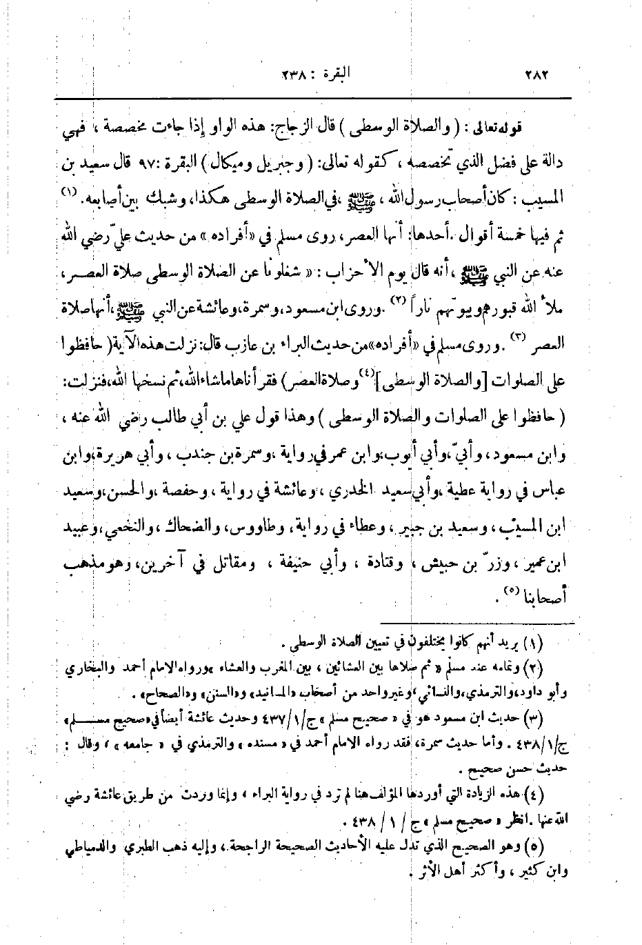 قوله تعالى والصلاة الوسطى قال الزجاج هذه الواو إذا جاءت مخصصة فهي دالة على فضل الذي تخصصه كقوله تعالى و جبريل وميكال البقرة 97 قال سعيد بن المسيب كان أصحاب رسول الله صلى الله عليه و سلم في الصلاة الوسطى هكذا وشبك بين أصابعه ثم فيها خمسة أقوال أحدها أنها العصر روى مسلم في أفراده من حديث علي رضي الله عنه عن النبي صلى الله عليه و سلم أنه قال يوم الأحزاب شغلونا عن الصلاة الوسطى صلاة العصر ملأ الله قبورهم وبيوتهم نارا وروى ابن مسعود وسمرة وعائشة عن النبي صلى الله عليه و سلم أنها صلاة العصر وروى مسلم في أفراده من حديث البراء بن عازب قال نزلت هذه الآية حافظوا على الصلوات والصلاة الوسطى وصلاة العصر فقراناها ما شاء الله ثم نسخها الله فنزلت حافظوا على الصلوات والصلاة الوسطى وهذا قول علي بن أبي طالب رضي الله عنه وابن مسعود وأبي أيوب وابن عمر في رواية وسمرة بن جندب و أبي هريرة وابن عباس في رواية عطية و أبي سعيد الخدري وعائشة في رواية وحفصة والحسن وسعيد ابن المسيب وسعيد بن جبير وعطاء في رواية وطاووس و الضحاك والنخعي وعبيد ابن عمير وزر بن حبيش وقتادة وأبي حنيفة و مقاتل في آخرين وهو مذهب أصحابنا