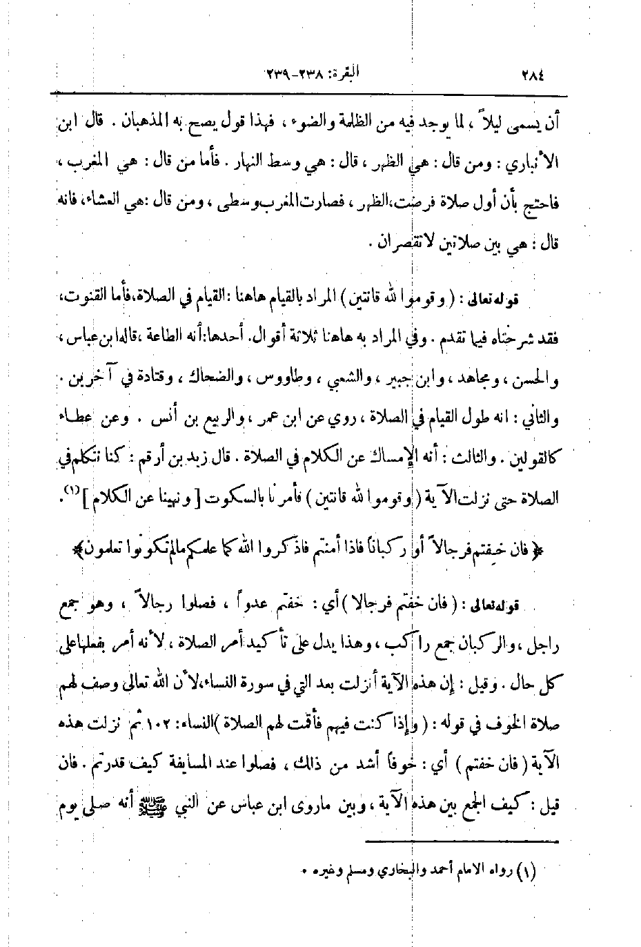 قوله تعالى وقوموا لله قانتين المراد بالقيام هاهنا القيام في الصلاة فأما القنوت فقد شرحناه فيما تقدم وفي المراد به هاهنا ثلاثة أقوال أحدها أنه الطاعة قاله ابن عباس والحسن و مجاهد وابن جبير والشعبي وطاووس و الضحاك وقتادة في آخرين والثاني أنه طول القيام في الصلاة روي عن ابن عمر والربيع بن أنس وعن عطاء كالقولين والثالث أنه الإمساك عن الكلام في الصلاة قال زيد بن أرقم كنا نتكلم في الصلاة حتى نزلت الآية وقوموا لله قانتين فأمرنا بالسكوت ونهينا عن الكلام