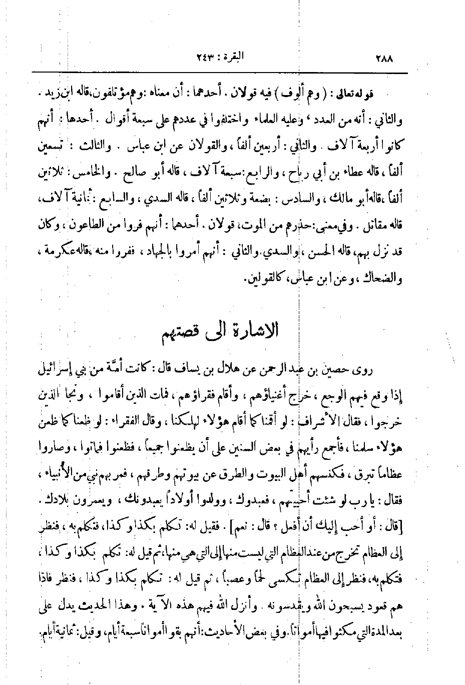 روى حصين بن عبد الرحمن عن هلال بن يساف قال كانت أمة من بني إسرائيل إذا وقع فيهم الوجع خرج أغنياؤهم وأقام فقراؤهم فمات الذين أقاموا ونجا الذين خرجوا فقال الأشراف لو أقمنا كما أقام هؤلاء لهلكنا وقال الفقراء لو ظعنا كما ظعن هؤلاء سلمنا فأجمع رأيهم في بعض السنين على أن يظعنوا جميعا فظعنوا فماتوا وصاروا عظاما تبرق فكنسهم أهل البيوت والطرق عن بيوتهم وطرقهم فمر بهم نبي من الأنبياء فقال يا رب لو شئت أحييتهم فعبدوك وولدوا أولادا يعبدونك ويعمرون بلادك قال أو أحب إليك أن أفعل قال نعم فقيل له تكلم بكذا وكذا فتكلم به فنظر إلى العظام تخرج من عند العظام التي ليست منها إلى التي هي منها ثم قيل له تكلم بكذا وكذا فتكلم به فنظر إلى العظام تكسى لحما وعصبا ثم قيل له تكلم بكذا وكذا فنظر فاذا هم قعود يسبحون الله ويقدسونه وأنزل الله فيهم هذه الآيه وهذا الحديث يدل على بعد المدة التي مكثوا فيها أمواتا وفي بعض الأحاديث أنهم بقوا أمواتا سبعة أيام وقيل ثمانية أيام
