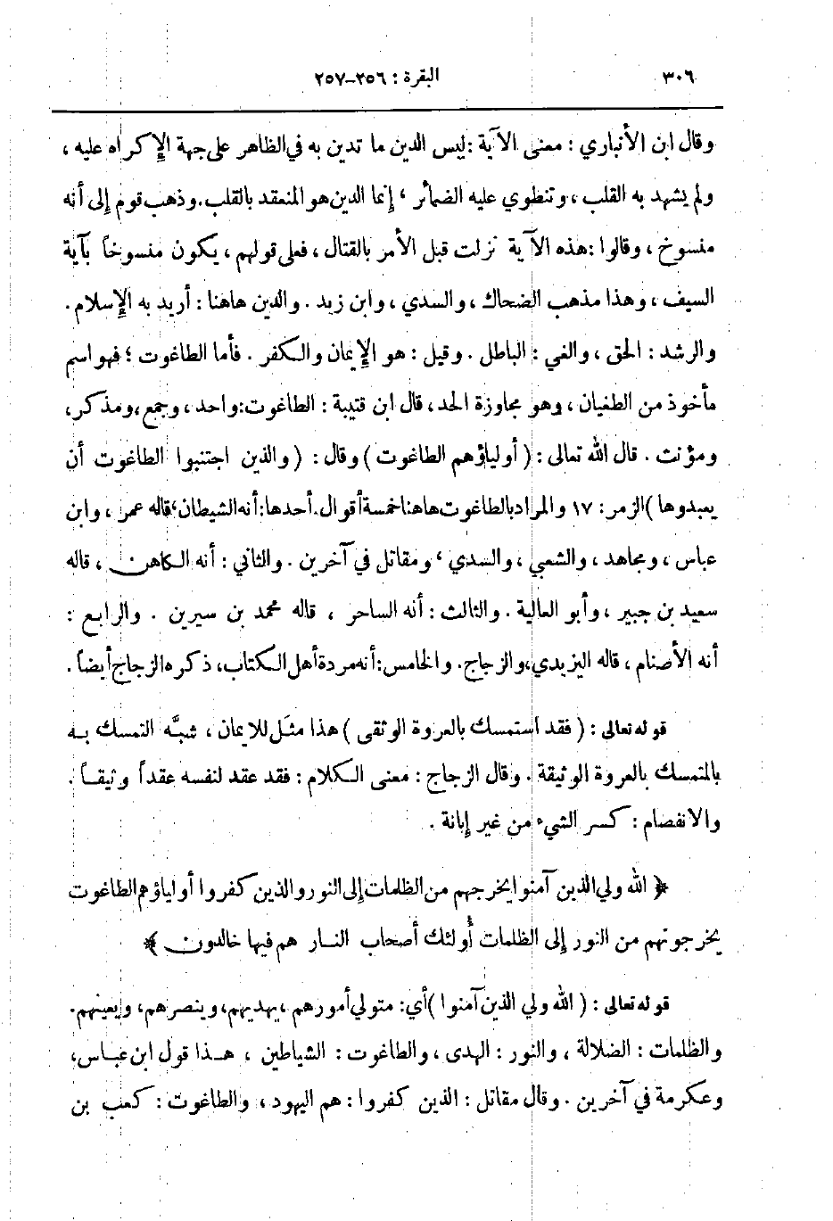 وقال ابن الأنباري معنى الآية ليس الدين ما تدين به في الظاهر على جهة الإكراه عليه ولم يشهد به القلب وتنطوي عليه الضمائر إنما الدين هو المنعقد بالقلب وذهب قوم إلى أنه منسوخ وقالوا هذه الآية نزلت قبل الأمر بالقتال فعلى قولهم يكون منسوخا بآية السيف وهذا مذهب الضحاك والسدي وابن زيد والدين هاهنا أريد به الإسلام والرشد الحق والغي الباطل وقيل هو الإيمان والكفر فاما الطاغوت فهو اسم مأخوذ من الطغيان وهو مجاوزة الحد قال ابن قتيبة الطاغوت واحد وجمع ومذكر ومؤنث قال الله تعالى أولياؤهم الطاغوت وقال والذين اجتنبوا الطاغوت أن يعبدوها الزمر 17 والمراد بالطاغوت هاهنا خمسة أقوال أحدها أنه الشيطان قاله عمر و ابن عباس و مجاهد والشعبي والسدي و مقاتل في آخرين والثاني أنه الكاهن قاله سعيد بن جبير و أبوالعالية والثالث أنه الساحر قاله محمد بن سيرين والرابع أنه الأصنام قاله اليزيدي و الزجاج والخامس أنه مردة أهل الكتاب ذكره الزجاج أيضا