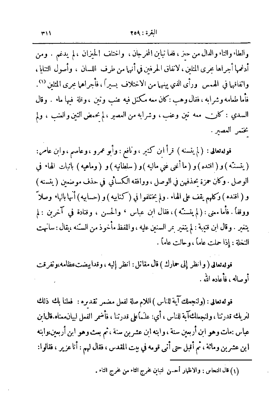 قوله تعالى لم يتسنه قرأ ابن كثير ونافع و أبو عمرو وعاصم وابن عامر يتسنة و اقتده و ما أغنى عني ماليه و سلطانيه و وماهيه باثبات الهاء في الوصل وكان حمزة يحذفهن في الوصل ووافقه الكسائي في حذف موضعين يتسنه و اقتده وكلهم يقف على الهاء ولم يختلفوا في كتابيه و حسابيه أنها بالهاء وصلا ووقفا فأما معنى لم يتسنه فقال ابن عباس والحسن وقتادة في آخرين لم يتغير وقال ابن قتيبة لم يتغير بمر السنين عليه واللفظ مأخوذ من السنه يقال سانهت النخلة إذا حملت عاما وحالت عاما