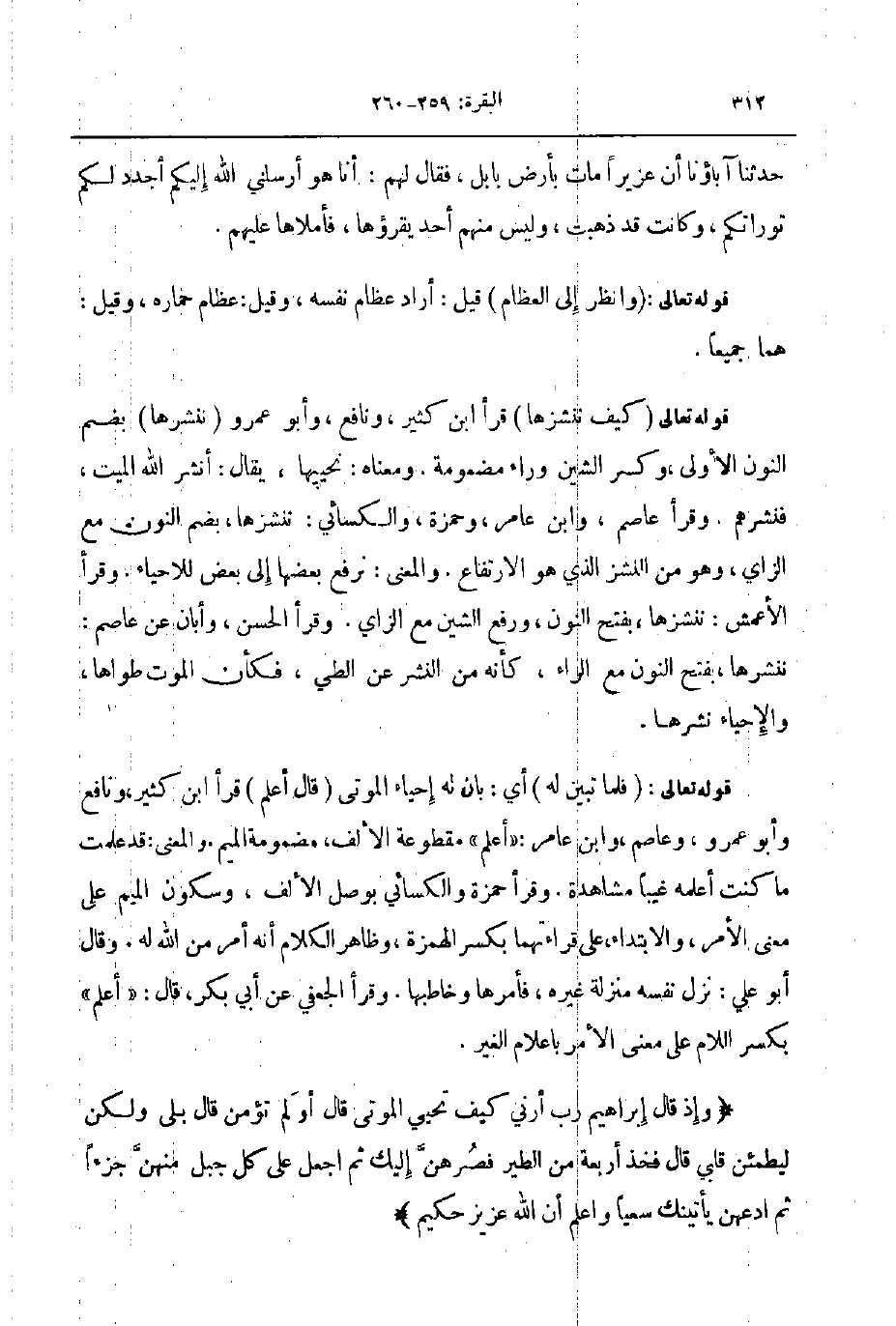 قوله تعالى كيف ننشزها قرأ ابن كثير ونافع وابو عمرو ننشرها بضم النون الأولى وكسر الشين وراء مضمومة ومعناه نحييها يقال أنشز الله الميت فنشرهم وقرأ عاصم وابن عامر وحمزة والكسائي ننشزها بضم النون مع الزاي وهو من النشز الذي هو الارتفاع والمعنى نرفع بعضها إلى بعض للاحياء وقرأ الأعمش ننشزها بفتح النون ورفع الشين مع الزاي وقرأ الحسن وأبان عن عاصم ننشرها بفتح النون مع الراء كأنه من النشر عن الطي فكأن الموت طواها والإحياء نشرها