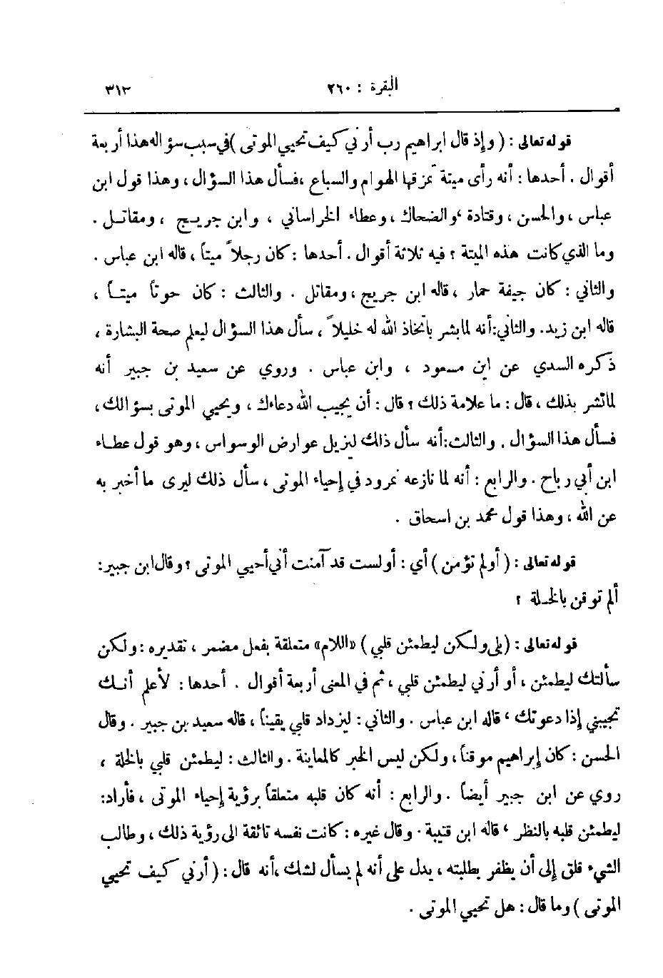 قوله تعالى و إذ قال إبراهيم رب أرني كيف تحيي الموتى في سبب سؤاله هذا أربعة أقوال أحدها أنه رأى ميتة تمزقها الهوام والسباع فسأل هذا السؤال وهذا قول ابن عباس والحسن وقتادة و الضحاك وعطاء الخراساني وابن جريج و مقاتل وما الذي كانت هذه الميتة فيه ثلاثة أقوال أحدها كان رجلا ميتا قاله ابن عباس والثاني كان جيفة حمار قاله ابن جريج و مقاتل والثالث كان حوتا ميتا قاله ابن زيد والثاني أنه لما بشر باتخاذ الله له خليلا سأل هذا السؤال ليعلم صحة البشارة ذكره السدي عن ابن مسعود و ابن عباس وروي عن سعيد بن جبير أنه لما بشر بذلك قال ما علامة ذلك قال أن يجيب الله دعاءك ويحيي الموتى بسؤالك فسأل هذا السؤال والثالث أنه سأل ذلك ليزيل عوارض الوسواس وهو قول عطاء ابن أبي رباح والرابع أنه لما نازعه نمرود في إحياء الموتى سأل ذلك ليرى ما أخبر به عن الله وهذا قول محمد بن اسحاق