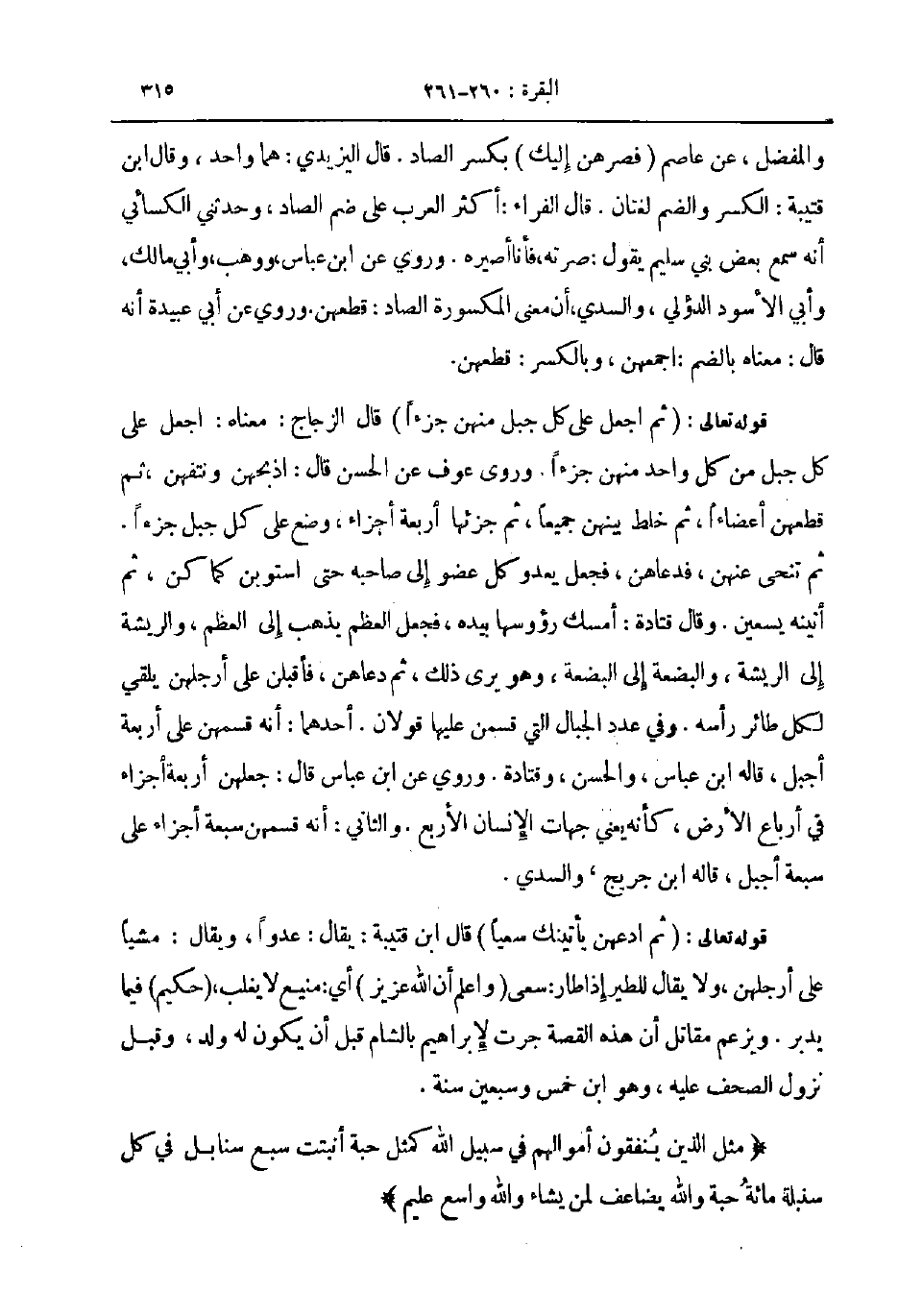والمفضل عن عاصم فصرهن إليك بكسر الصاد قال اليزيدي هما واحد وقال ابن قتيبة الكسر والضم لغتان قال الفراء أكثر العرب على ضم الصاد وحدثني الكسائي أنه سمع بعض بني سليم يقول صرته فأنا أصيره وروي عن ابن عباس ووهب وابي مالك وابي الأسود الدؤلي والسدي أن معنى المكسورة الصاد قطعهن وروي عن أبي عبيدة أنه قال معناه بالضم اجمعهن وبالكسر قطعهن