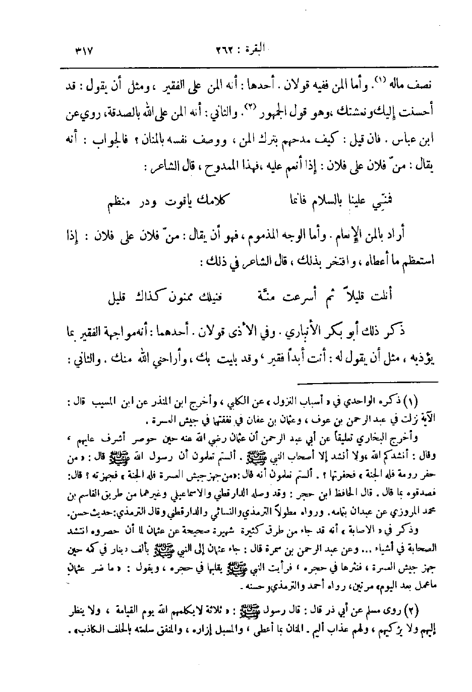 نف ماله وأما المن ففيه قولان أحدها أنه المن على الفقير ومثل أن يقول قد أحسنت إليك ونعشتك وهو قول الجمهور والثاني أنه المن على الله بالصدقة روي عن ابن عباس فان قيل كيف مدحهم بترك المن ووصف نفسه بالمنان فالجواب أنه يقال من فلان على فلان إذا أنعم عليه فهذا الممدوح قال الشاعر ... فمني علينا بالسلام فانما ... كلامك ياقوت ودر منظم ...