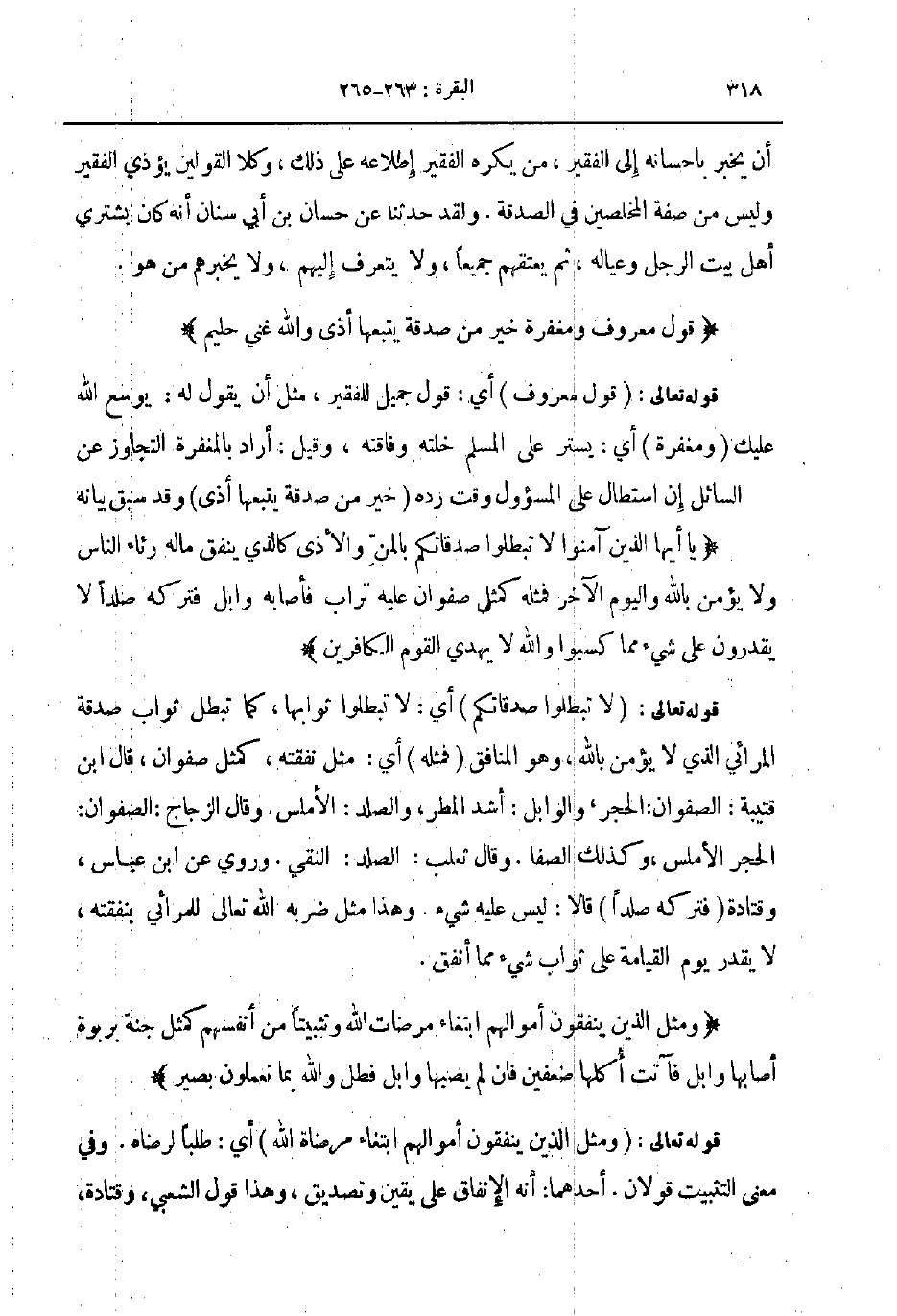 قوله تعالى لا تبطلوا صدقاتكم أي لا تبطلوا ثوابها كما تبطل ثواب صدقة المرائي الذي لا يؤمن بالله وهو المنافق فمثله أي مثل نفقته كمثل صفوان قال ابن قتيبه الصفوان الحجر والوابل أشد المطر والصلد الأملس وقال الزجاج الصفوان الحجر الأملس وكذلك الصفا وقال ثعلب الصلد النقي وروي عن ابن عباس وقتادة فتركه صلدا قالا ليس عليه شيء وهذا مثل ضربه الله تعالى للمرائي بنفقته لا يقدر يوم القيامة على ثواب شيء مما أنفق