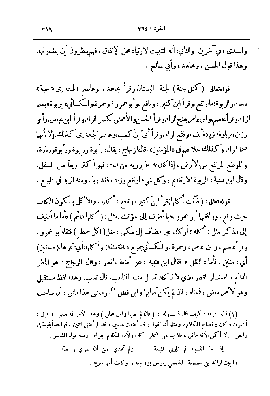 قوله تعالى فآتت أكلها قرأ ابن كثير ونافع أكلها والأكل بسكون الكاف حيث وقع ووافقهما أبو عمرو فيما أضيف إلى مؤنث مثل أكلها دائم فأما ما أضيف إلى مذكر مثل أكله أو كان غير مضاف إلى مكنى مثل أكل خمط فثقله أبو عمرو وقرأ عاصم وابن عامر وحمزة والكسائي جيمع ذلك مثقلا وأكلها أي ثمرها ضعفين أي مثلين فأما الظل فقال ابن قتيبة هو أضعف المطر وقال الزجاج هو المطر الدائم الصغار القطر الذي لا تكاد تسيل منه المثاعب قال ثعلب وهذا لفظ مستقبل وهو لأمر ماض فمعناه فان لم يكن أصابها وابل فطل ومعنى هذا المثل أن صاحب
