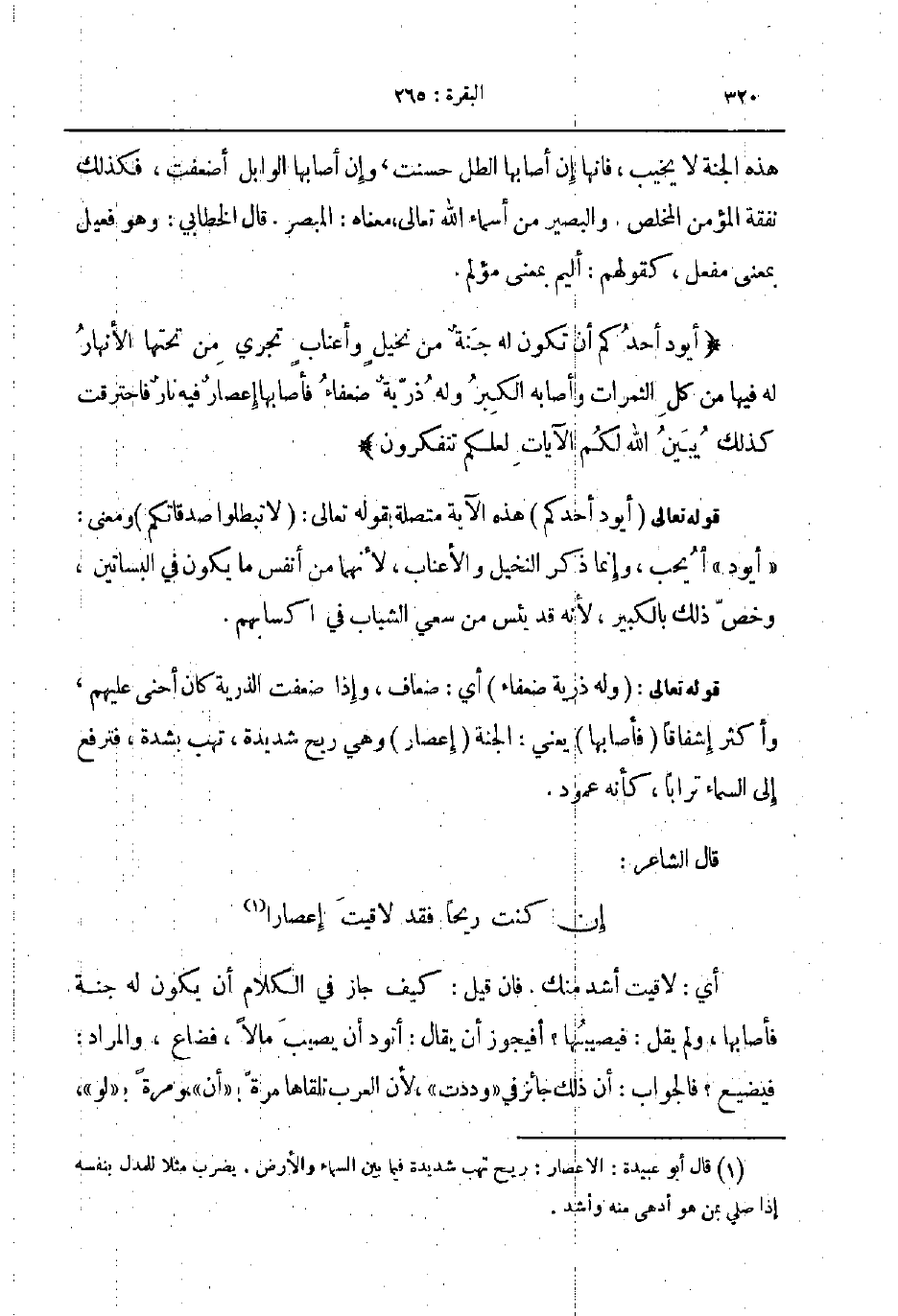 قوله تعالى أيود أحدكم هذه الآية متصلة بقوله تعالى لا تبطلوا صدقاتكم ومعنى أيود أيحب و إنما ذكر النخيل والأعناب لأنهما من أنفس ما يكون في البساتين وخص ذلك بالكبير لأنه قد يئس من سعي الشباب في اكسابهم