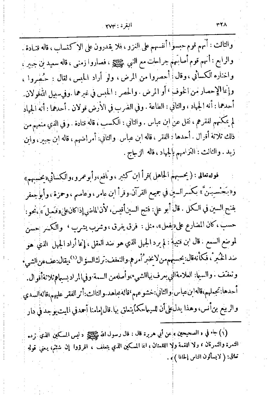 قوله تعالى يحسبهم الجاهل قرأ ابن كثير ونافع و أبو عمرو والكسائي يحسبهم و يحسبن بكسر السين في جميع القرآن وقرأ ابن عامر وعاصم وحمزة وابو جعفر بفتح السين في الكل قاله أبو علي فتح السين أقيس لأن الماضي إذا كان على فعل نحو حسب كان المضارع على يفعل مثل فرق يفرق وشرب يشرب والكسر حسن لموضع السمع قاله ابن قتيبة لم يرد الجهل الذي هو ضد العقل إنما أراد الجهل الذي هو ضد الخبر فكأنه قال يحسبهم من لا يخبر أمرهم والتعفف ترك السؤال يقال عف عن الشيء وتعفف والسيما العلامة التي يعرف بها الشيء وأصله من السمة وفي المراد بسيماهم ثلاثة أقوال أحدها تجملهم قاله ابن عباس والثاني خشوعهم قاله مجاهد والثالث أثر الفقر عليهم قاله السدي والربيع بن أنس وهذا يدل على أن للسيما حكما يتعلق بها قال إمامنا أحمد في الميت يوجد في دار