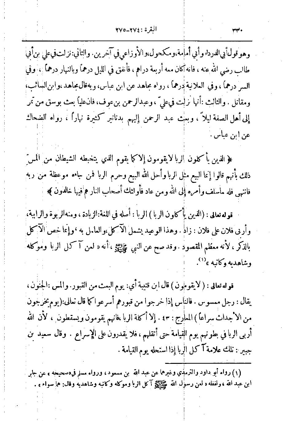 قوله تعالى الذين يأكلون الربا الربا أصله في اللغة الزيادة ومنه الربوة والرابية و أربى فلان على فلان زاد وهذا الوعيد يشمل الآكل والعامل به و إنما خص الآكل بالذكر لأنه معظم المقصود وقد صح عن النبي صلى الله عليه و سلم أنه لعن آكل الربا وموكله وشاهديه وكاتبه