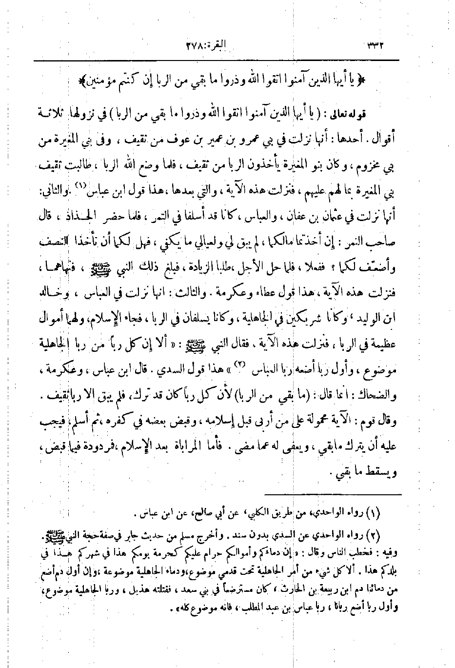 قوله تعالى يا أيها الذين آمنوا اتقوا الله وذروا ما بقي من الربا في نزولها ثلاثة أقوال أحدها أنها نزلت في بني عمرو بن عمير بن عوف من ثقيف وفي بني المغيرة من بني مخزوم وكان بنو المغيرة يأخذون الربا من ثقيف فلما وضع الله الربا طالبت ثقيف بني المغيرة بما لهم عليهم فنزلت هذه الآية والتي بعدها هذا قول ابن عباس والثاني أنها نزلت في عثمان بن عفان والعباس كانا قد أسلفا في التمر فلما حضر الجذاذ قال صاحب التمر إن أخذتما مالكما لم يبق لي ولعيالي ما يكفي فهل لكما أن تأخذا النصف وأضعف لكما ففعلا فلما حل الأجل طلبا الزيادة فبلغ ذلك النبي صلى الله عليه و سلم فنهاهما فنزلت هذه الآية هذا قول عطاء وعكرمة والثالث أنها نزلت في العباس وخالد بن الوليد وكانا شريكين في الجاهلية وكانا يسلفان في الربا فجاء الإسلام ولهما أموال عظيمة في الربا فنزلت هذه الآية فقال النبي صلى الله عليه و سلم ألا إن كل ربا من ربا الجاهلية موضوع وأول ربا أضعه ربا العباس هذا قول السدي قال ابن عباس وعكرمة والضحاك إنما قال ما بقي من الربا لأن كل ربا كان قد ترك فلم يبق إلا ربا ثقيف وقال قوم الآية محمولة على من أربى قبل إسلامه وقبض بعضه في كفره ثم أسلم فيجب عليه أن يترك ما بقي ويعفى له عما مضى فأما المراباة بعد الإسلام فمردوده فيما قبض ويسقط ما بقي