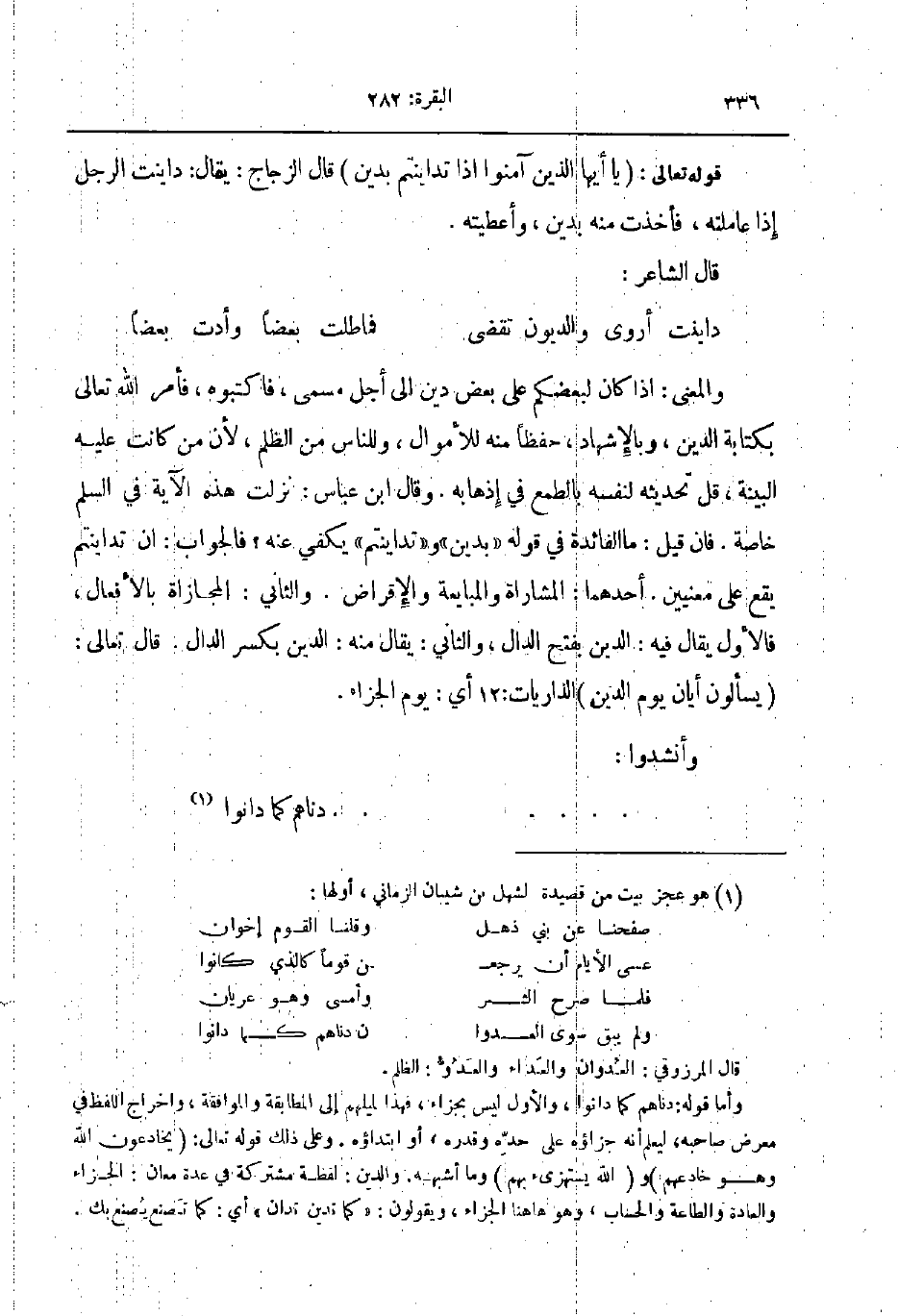 والمعنى إذا كان لبعضكم على بعض دين إلى أجل مسمى فاكتبوه فأمر الله تعالى بكتابة الدين وبالإشهاد حفظا منه للأموال وللناس من الظلم لأن من كانت عليه البينة قل تحديثه لنفسه بالطمع في إذهابه وقال ابن عباس نزلت هذه الآية في السلم خاصة فان قيل ما الفائدة في قوله بدين وتداينتم يكفي عنه فالجواب أن تداينتم يقع على معنيين أحدهما المشاراة والمبايعة والإقراض والثاني المجازاة بالأفعال فالأول يقال فيه الدين بفتح الدال والثاني يقال منه الدين بكسر الدال قال تعالى يسألون أيان يوم القيامة الذاريات12 أي يوم الجزاء
