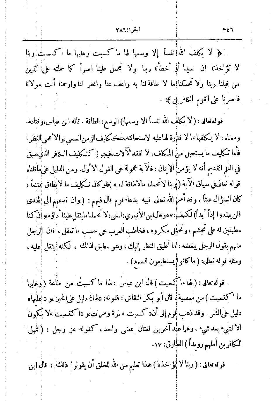 قوله تعالى لا يكلف الله نفسا إلا وسعها الوسع الطاقة قاله ابن عباس وقتادة ومعناه لا يكلفها ما لا قدرة لها عليه لاستحالته كتكليف الزمن السعي والأعمى النظر فأما تكليف ما يستحيل من المكلف لالفقد الآلات فيجوز كتكليف الكافر الذي سبق في العلم القديم أنه لا يؤمن الإيمان فالآية محمولة على القول الأول ومن الدليل على ما قلناه قوله تعالى في سياق الآية ربنا لا تحملنا مالا طاقة لنا به فلو كان تكليف ما لا يطاق ممتنعا كان السؤال عبثا وقد أمر الله تعالى نبيه بدعاء قوم قال فيهم وان تدعهم إلى الهدى فلن يهتدوا إذا أبدا الكهف 57 وقال ابن الأنباري المعنى لا تحملنا ما يثقل علينا أداؤه وان كنا مطيقين له على تجشم وتحمل مكروه فخاطب العرب على حسب ما تعقل فان الرجل منهم يقول للجل يبغضه ما أطيق النظر إليك وهو مطيق لذلك لكنه يثقل عليه ومثله قوله تعالى ما كانوا يستطيعون السمع