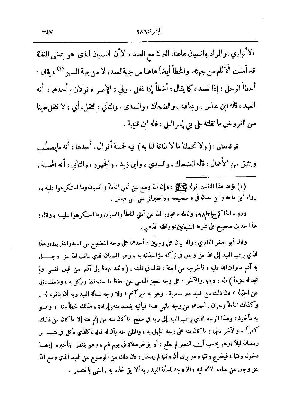 الأنباري والمراد بالنسيان هاهنا الترك مع العمد لأن النسيان الذي هو بمعنى الغفلة قد أمنت الآثام من جهته والخطأ أيضا هاهنا من جهة العمد لا من جهة السهو يقال أخطأ الرجل إذا تعمد كما يقال أخطأ إذا غفل وفي الإصر قولان أحدهما أنه العهد قاله ابن عباس و مجاهد و الضحاك والسدي و الثاني الثقل أي لا تثقل علينا من الفروض ما ثقلته على بني اسرائيل قاله ابن قتيبة