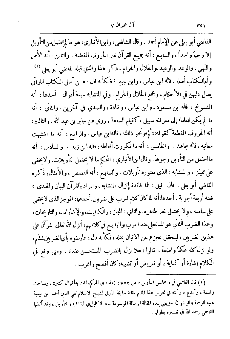 القاضي أبو يعلى عن الإمام أحمد وقال الشافعي و ابن الأنباري هو ما لم يحتمل من التأويل إلا وجها واحدا والسابع أنه جميع القرآن غير الحروف المقطعة والثامن أنه الامر والنهي والوعد والوعيد والحلال والحرام ذكر هذا والذي قبله القاضي أبو يعلى و أم الكتاب أصله قاله ابن عباس وابن جبير فكأنه قال هن أصل الكتاب اللواتي يعمل عليهن في الاحكام ومجمع الحلال والحرام وفي المتشابه سبعة أقوال أحدها أنه المنسوخ قاله ابن مسعود و ابن عباس وقتادة والسدي في آخرين والثاني أنه ما لم يكن للعلماء إلى معرفته سبيل كقيام الساعة روي عن جابر بن عبد الله والثالث أنه الحروف المقطعة كقوله ألم ونحو ذلك قاله ابن عباس والرابع أنه ما اشتبهت معانيه قاله مجاهد والخامس أنه ما تكررت ألفاظه قاله ابن زيد والسادس أنه ما احتمل من التأويل وجوها وقال ابن الأنباري المحكم ما لا يحتمل التأويلات ولا يخفى على مميز والمتشابه الذي تعتوره تأويلات والسابع أنه القصص والأمثال ذكره القاضي أبو يعلى فإن قيل فما فائدة إنزال المتشابه والمراد بالقرآن البيان والهدى فعنه أربعة أجوبه أحدها أنه لما كان كلام العرب على ضربين أحدهما الموجز الذي لا يخفى على سامعه ولا يحتمل غير ظاهره والثاني المجاز والكنايات ولإشارات والتلويحات وهذا الضرب الثاني هو المستحلى عند العرب والبديع في كلامهم أنزل الله تعالى القرآن على هذين الضربين ليتحقق عجزهم عن الاتيان بمثله فكأنه قال عارضوه بأي الضربين شئتم ولو نزل كله محكما واضحا لقالوا هلا نزل بالضرب المستحسن عندنا ومتى وقع في الكلام إشارة أو كناية أو تعريض أو تشبيه كان أفصح وأغرب