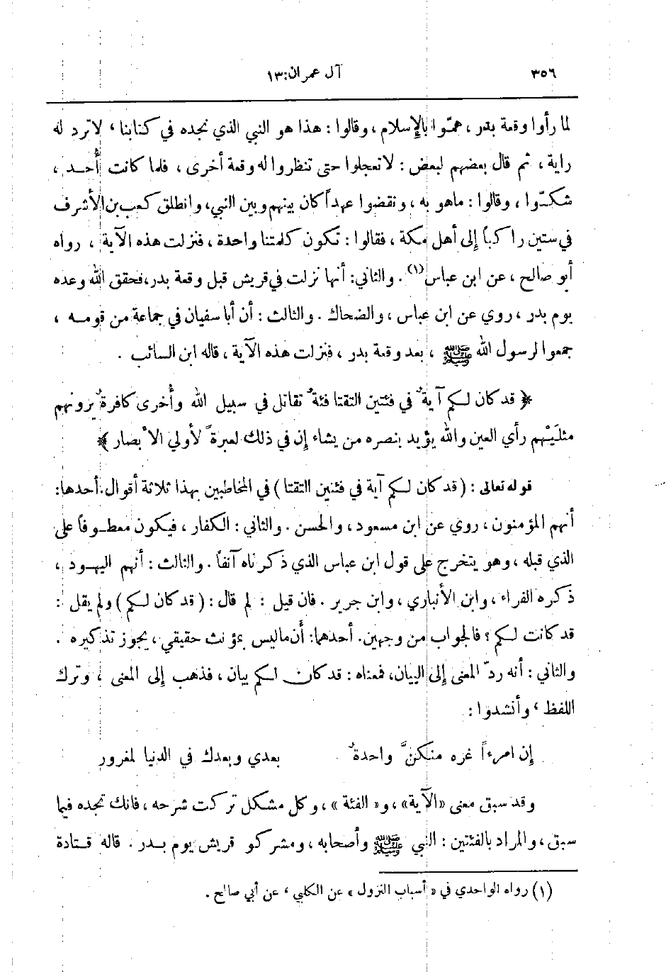 قد كان لكم آية في فئتين التقتا فئة تقاتل في سبيل الله و اخرى كافرة يرونهم مثليهم رأي العين والله يؤيد بنصره من يشاء إن في ذلك لعبرة لأولي الأبصار