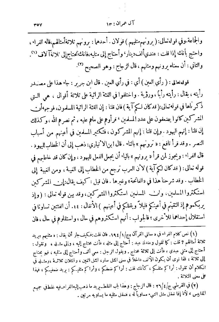 والجماعة وفي قوله تعالى يرونهم مثليهم قولان أحدهما يرونهم ثلاثة أمثالهم قاله الفراء واحتج بأنك إذا قلت عندي ألف دينار و أحتاج إلى مثليه فانك تحتاج إلى ثلاثة آلاف والثاني أن معناه يرونهم ومثلهم قال الزجاج وهو الصحيح