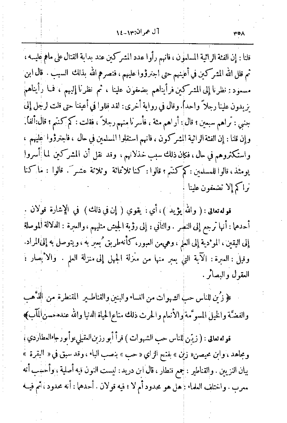 قوله تعالى زين للناس حب الشهوات قرأ أبو رزين العقيلي وابو رجاء العطاردي و مجاهد وابن محيصن زين بفتح الزاي حب بنصب الباء وقد سبق في البقرة بيان التزيين والقناطير جمع قنطار قال ابن دريد ليست النون فيه أصليه وأحسب أنه معرب واختلف العلماء هل هو محدود أم لا فيه قولان أحدهما أنه محدود ثم فيه