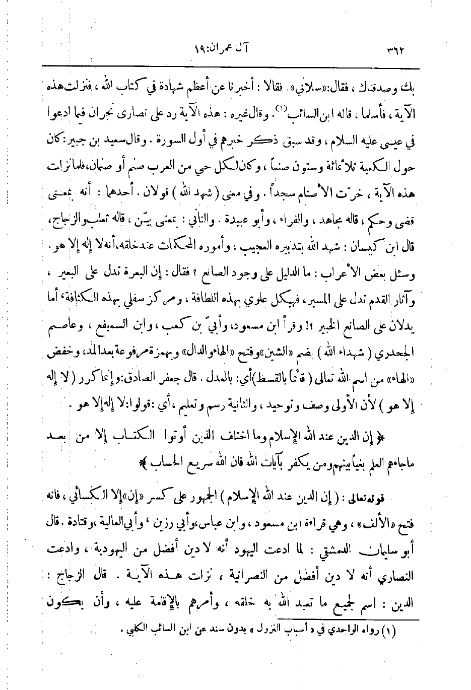 قوله تعالى إن الدين عند الله الإسلام الجمهور على كسر إن إلا الكسائي فانه فتح الألف وهي قراءة ابن مسعود و ابن عباس وأبي رزين و أبي العالية وقتادة قال أبو سليمان الدمشقي لما ادعت اليهود أنه لا دين أفضل من اليهودية وادعت النصارى أنه لا دين أفضل من النصرانية نزلت هذه الآية قال الزجاج الدين اسم لجميع ما تعبد الله به خلقه وأمرهم بالإقامة عليه و أن يكون