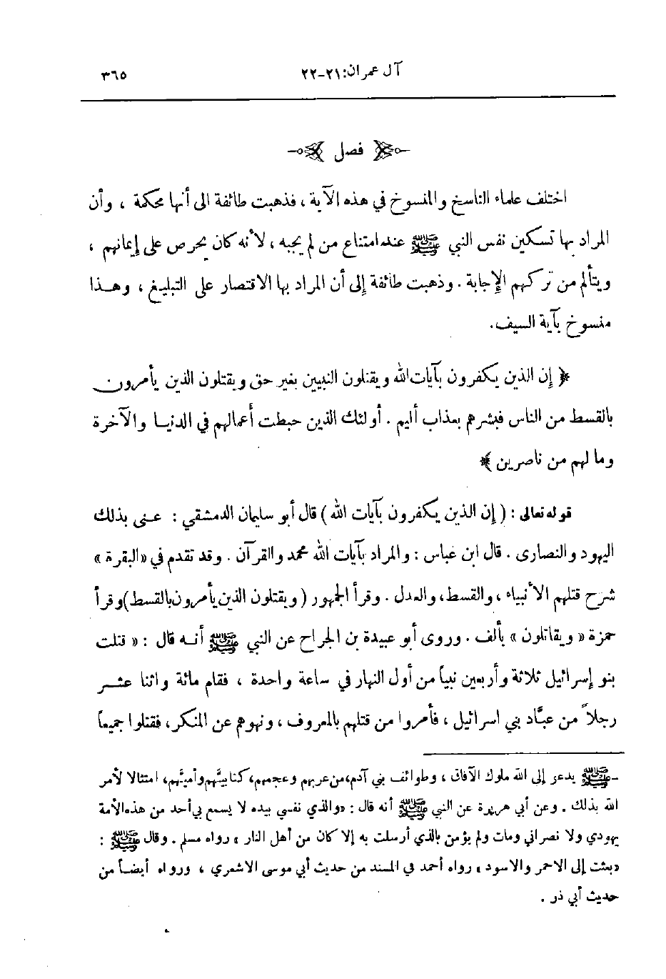 قوله تعالى إن الذين يكفرون بآيات الله قال أبو سليمان الدمشقي عنى بذلك اليهود والنصارى قال ابن عباس والمراد بآيات الله محمد والقران وقد تقدم في البقرة شرح قتلهم الأنبياء والقسط والعدل وقرأ الجمهور ويقتلون الذين يأمرون بالقسط وقرأ حمزة ويقاتلون بألف وروى أبو عبيدة بن الجراح عن النبي صلى الله عليه و سلم أنه قال قتلت بنو إسرائيل ثلاثة وأربعين نبيا من أول النهار في ساعة واحدة فقام مائة واثنا عشر رجلا من عباد بني اسرائيل فأمروا من قتلهم بالمعروف ونهوهم عن المنكر فقتلوا جميعا