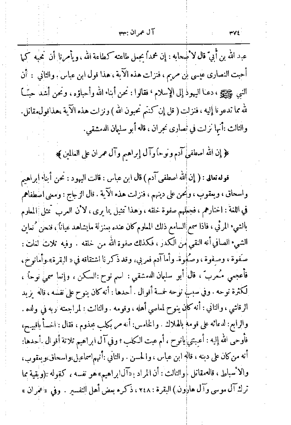 قوله تعالى إن الله اصطفى آدم قال ابن عباس قالت اليهود نحن أبناء إبراهيم واسحاق ويعقوب ونحن على دينهم فنزلت هذه الآية قال الزجاج ومعنى اصطفاهم في اللغة اختارهم فجعلهم صفوة خلقة وهذا تمثيل بما يرى لأن العرب تمثل المعلوم بالشيء المرئي فاذا سمع السامع ذلك المعلوم كان عنده بمنزلة ما يشاهد عيانا فنحن نعاين الشيء الصافي أنه النقي من الكدر فكذلك صفوة الله من خلقه وفيه ثلاث لغات صفوة وصفوة وصفوة و صفوة تاما وأما آدم فعربي وقد ذكرنا اشتقاقه في البقرة و أما نوح فأعجمي معرب قال أبو سليمان الدمشقي اسم نوح السكن و إنما سمي نوحا لكثرة نوحه وفي سبب نوحه خمسة أقوال احدها أنه كان ينوح على نفسه قاله يزيد الرقاشي والثاني أنه كان ينوح لمعاصي اهله وقومه والثالث لمراجعته ربه في ولده والرابع لدعائه على قومه بالهلاك والخامس أنه مر بكلب مجذوم فقال اخسأ يا قبيح فأوحى الله إليه أعبتني يا نوح أم عبت الكلب وفي آل إبراهيم ثلاثة أقوال أحدها أنه من كان على دينه قاله ابن عباس والحسن والثاني انهم اسماعيل واسحاق ويعقوب والأسباط قاله مقاتل والثالث أن المراد آل إبراهيم هو نفسه كقوله وبقية مما ترك آل موسى وآل هارون البقرة 248 ذكره بعض أهل التفسير وفي عمران