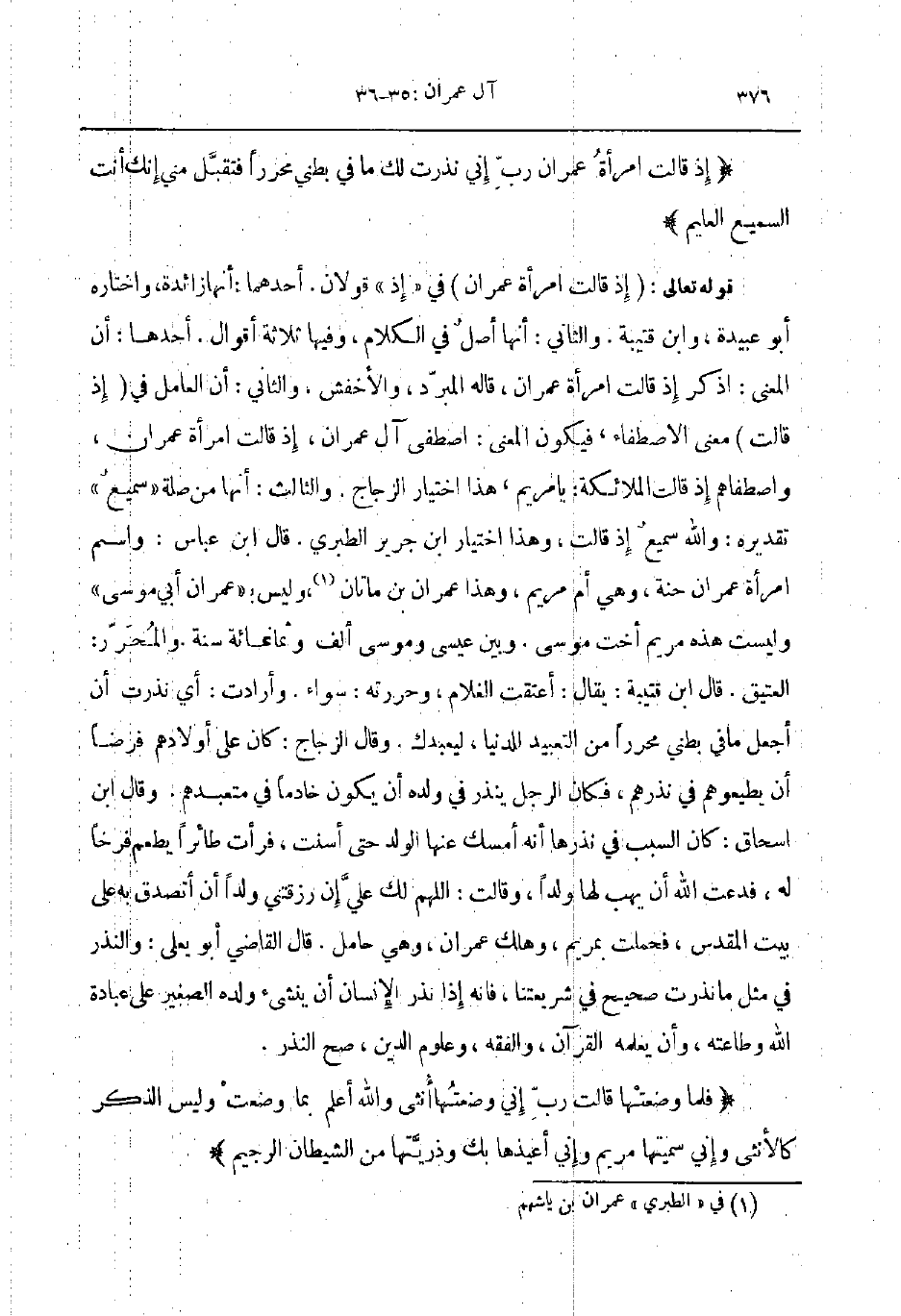 قوله تعالى إذ قالت امرأة عمران في إذ قولان أحدهما أنها زائدة واختاره أبو عبيدة و ابن قتيبة والثاني أنها أصل في الكلام وفيها ثلاثة أقوال أحدها أن المعنى اذكر إذ قالت امرأة عمران قاله المبرد والاخفش والثاني أن العامل في إذ قالت معنى الاصطفاء فيكون المعنى اصطفى آل عمران إذ قالت امرأة عمران واصطفاهم إذ قالت الملائكة يا مريم هذا اختيار الزجاج والثالث أنها من صلة سميع تقديره والله سميع إذ قالت وهذا اختيار ابن جرير الطبري قال ابن عباس واسم امرأة عمران حنة وهي أم مريم وهذا عمران بن ماتان وليس عمران أبي موسى وليست هذه مريم اخت موسى وبين عيسى وموسى ألف وثمانمائة سنة والمحرر العتيق قال ابن قتيبة يقال أعتقت الغلام وحررته سواء وأرادت أي نذرت أن أجعل ما في بطني محررا من التعبيد الدنيا ليعبدك وقال الزجاج كان على اولادهم فرضا أن يطيعوهم في نذرهم فكان الرجل ينذر في ولده أن يكون خادما في متعبدهم وقال ابن اسحاق كان السبب في نذرها أنه أمسك عنها الولد حتى أسنت فرأت طائرا يطعم فرخا له فدعت الله أن يهب لها ولدا وقالت اللهم لك علي إن رزقتني ولدا أن اتصدق به على بيت المقدس فحملت بمريم وهلك عمران وهي حامل قال القاضي أبو يعلى والنذر في مثل ما نذرت صحيح في شريعتنا فانه إذا نذر الإنسان أن ينشيء ولده الصغير على عبادة الله وطاعته و أن يعلمه القرآن والفقه وعلوم الدين صح النذر