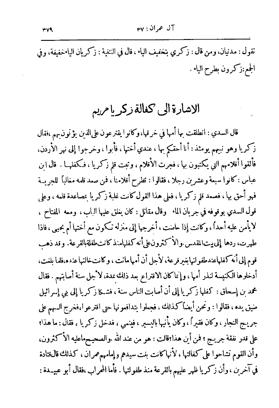 قال السدي انطلقت بها أمها في خرقها وكانوا يقترعون على الذين يؤتون بهم فقال زكريا وهو نبيهم يومئذ انا أحقكم بها عندي أختها فأبوا وخرجوا إلى نهر الأردن فألقوا أقلامهم التي يكتبون بها فجرت الأقلام وثبت قلم زكريا فكفلها قال ابن عباس كانوا سبعة وعشرين رجلا فقالوا نطرح أقلامنا فمن صعد قلمه مغالبا للجرية فهو أحق بها فصعد قلم زكريا فعلى هذا القول كانت غلبة زكريا بمصاعدة قلمه وعلى قول السدي بوقوفه في جريان الماء وقال مقاتل كان يغلق عليها الباب ومعه المفتاح لا يأمن عليه أحدا وكانت اذا حاضت أخرجها إلى منزلة تكون مع أختها أم يحيى فاذا طهرت ردها إلى بيت المقدس والأكثرون على أنه كفلها منذ كانت طفلة بالقرعة وقد ذهب قوم الى أنه كفلها عند طفولتها بغير قرعة لأجل أن أمها ماتت وكانت خالتها عنده فلما بلغت أدخلوها الكنيسة لنذر أمها و إنما كان الاقتراع بعد ذلك بمدة لأجل سنة أصابتهم فقال محمد بن إسحاق كفلها زكريا إلى أن أصابت الناس سنة فشكا زكريا إلى بني إسرائيل ضيق يده فقالوا ونحن أيضا كذلك فجعلوا يتدافعونها حتى اقترعوا فخرج السهم على جريج النجار وكان فقيرا وكان يأتيها باليسير فينمي فدخل زكريا فقال ما هذا على قدر نفقة جريج فمن اين هذا قالت هو من عند الله والصحيح ما عليه الأكثرون و أن القوم تشاحوا على كفالتها لأنها كانت بنت سيدهم وإمامهم عمران كذلك قال قتادة في آخرين و أن زكريا ظهر عليهم بالقرعة منذ طفولتها فأما المحراب فقال أبو عبيدة