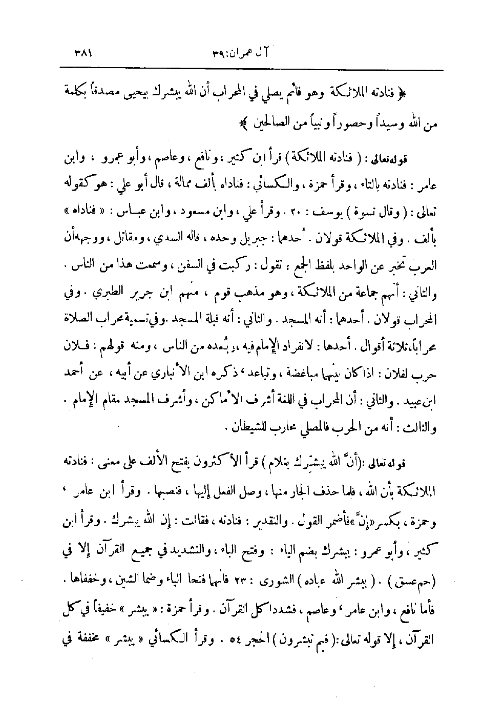 قوله تعالى فنادته الملائكة قرأ ابن كثير ونافع وعاصم وابو عمرو وابن عامر فنادته بالتاء وقرأ حمزة والكسائي فناداه بألف ممالة قال ابو علي هو كقوله تعالى وقال نسوة يوسف 20 وقرأ علي وابن مسعود و ابن عباس فناداه بألف وفي الملائكة قولان أحدهما جبريل وحده قال السدي و مقاتل ووجهه أن العرب تخبر عن الواحد بلفظ الجمع تقول ركبت في السفن وسمعت هذا من الناس والثاني انهم جماعة من الملائكة وهو مذهب قوم منهم ابن جرير الطبري وفي المحراب قولان أحدهما أنه المسجد والثني أنه قبلة المسجد وفي تسمية محراب الصلاة محرابا ثلاثة أقوال أحدها لانفراد الإمام فيه وبعده من الناس ومنه قولهم فلان حرب لفلان إذا كان بينهما مباغضة وتباعد ذكره ابن الأنباري عن أبيه عن أحمد بن عبيد والثاني أن المحراب في اللغة أشرف الأماكن و أشرف المسجد مقام الإمام والثالث أنه من الحرب فالمصلي محارب للشيطان