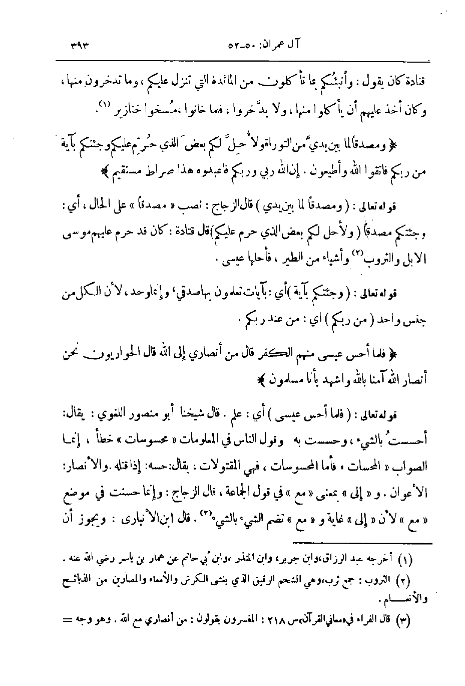 قوله تعالى فلما أحس عيسى أي علم قال شيخنا أبو منصور اللغوي يقال أحسست بالشيء وحسست به وقول الناس في المعلومات محسوسات خطأ إنما الصواب المحسات فأما المحسوسات فهي المقتولات يقال حسه إذا قتله والأنصار الأعوان و إلى بمعنى مع في قول الجماعة قال الزجاج و إنما حسنت في موضع مع لأن إلى غاية و مع تضم الشئ بالشئ قال ابن الأنباري ويجوز أن