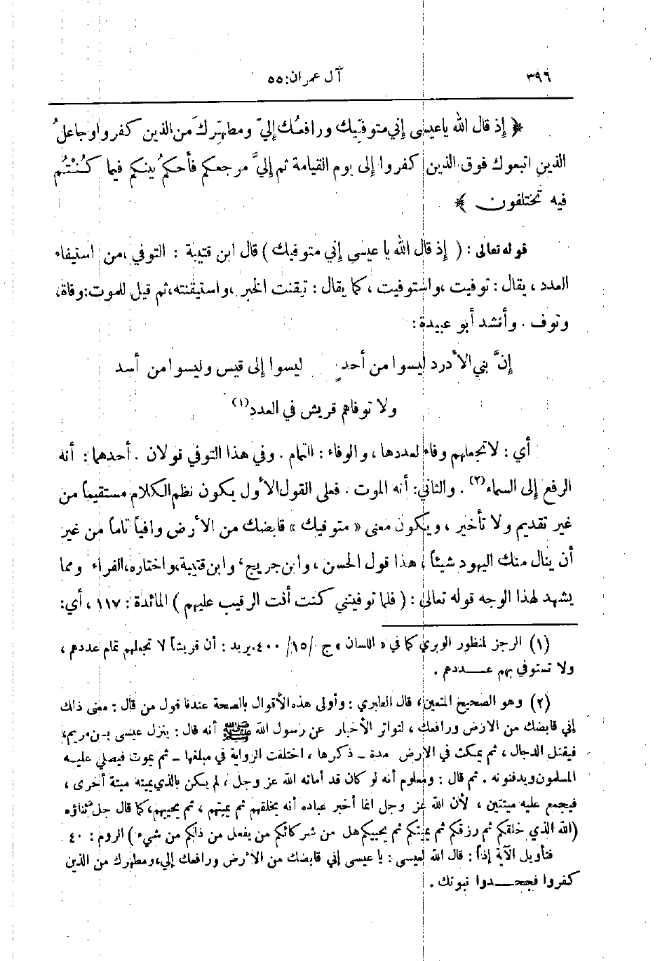 قوله تعالى إذ قال الله يا عيسى إني متوفيك قال ابن قتيبة التوفي من استيفاء العدد يقال توفيت واستوفيت كما يقال تيقنت الخبر واستيقنته ثم قيل للموت وفاة وتوف وأنشد أبو عبيدة ... إن بني الأدرد ليسوا من أحد ... ليسوا إلى قيس وليسوا من أسد ... ولا توفاهم قريش في العدد ...