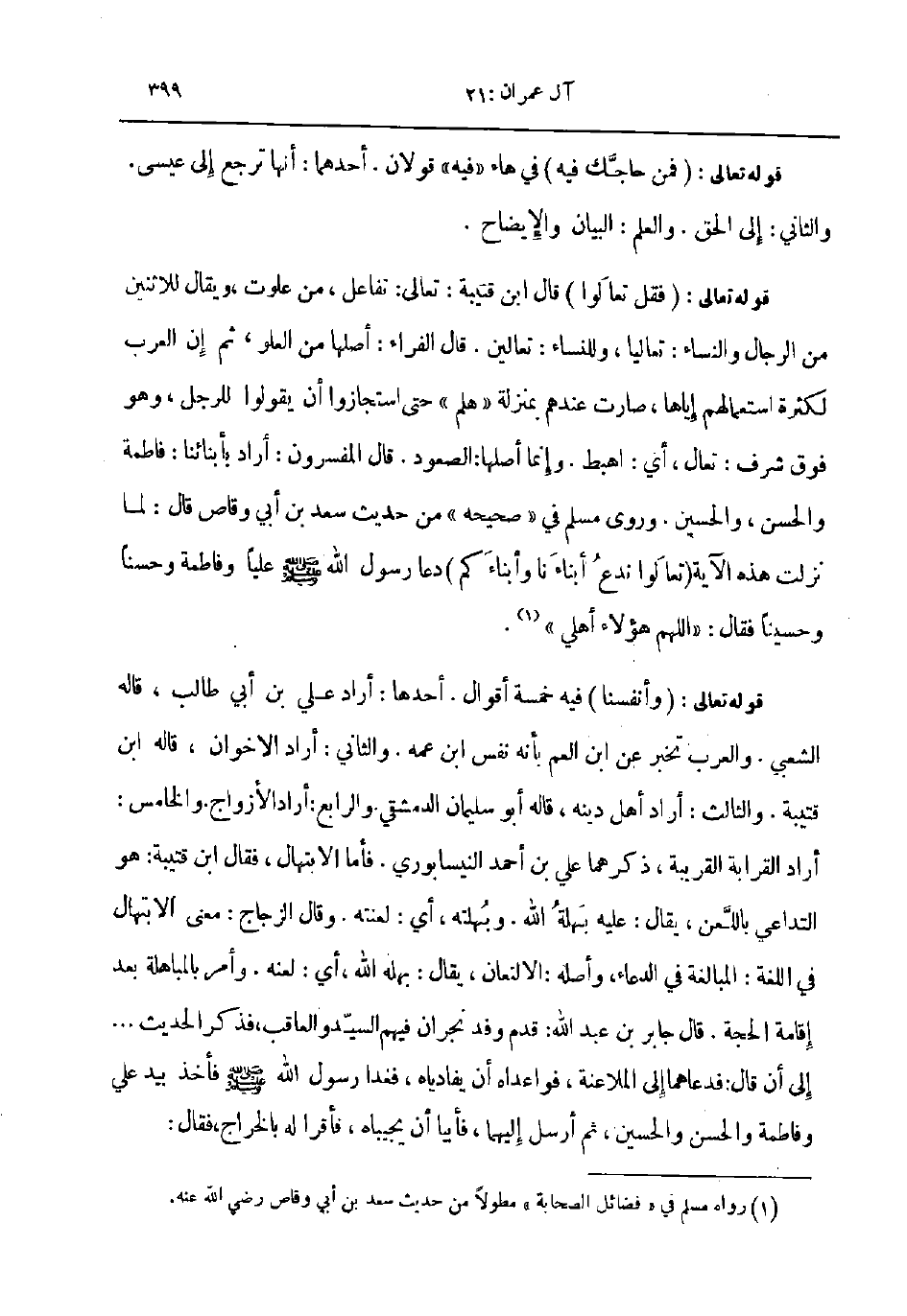 قوله تعالى فقل تعالوا قال ابن قتيبة تعالى تفاعل من علوت ويقال للاثنين من الرجال والنساء تعاليا وللنساء تعالين قال الفراء أصلها من العلو ثم إن العرب لكثرة استعمالهم إياها صارت عندهم بمنزلة هلم حتى استجازوا أن يقولوا للرجل وهو فوق شرف تعالى أي اهبط و إنما أصلها الصعود قا المفسرون أراد بأبنائنا فاطمة والحسن والحسين وروى مسلم في صحيحه من حديث سعد بن أبي وقاص قال لما نزلت هذه الآية تعالوا ندع أبناءنا وأبناءكم دعا رسول الله صلى الله عليه و سلم عليا وفاطمة وحسنا وحسينا فقال اللهم هؤلاء أهلي