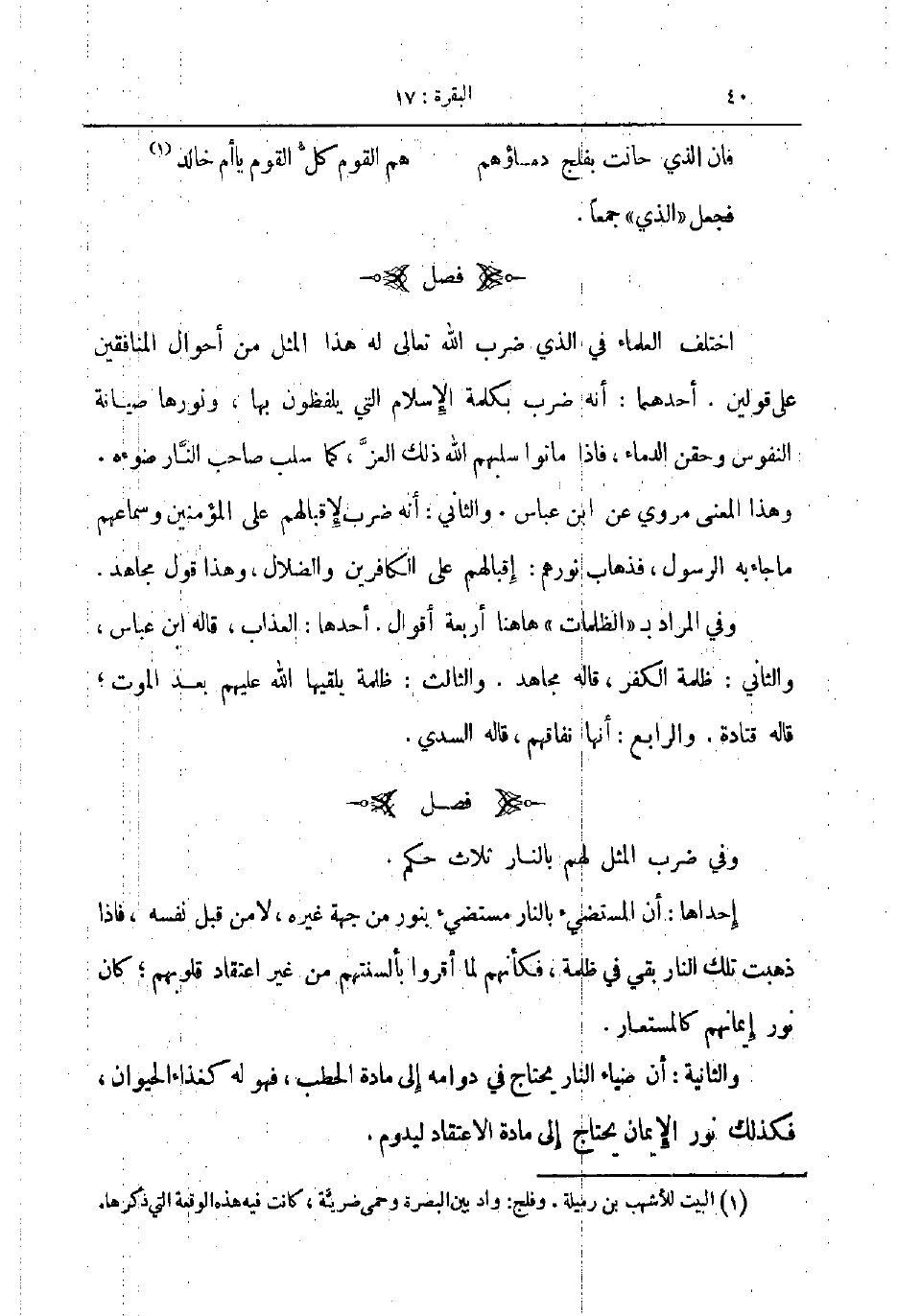 والثانية أن ضياء النار يحتاج في دوامه الى مادة الحطب فهو له كغذاء الحيوان فكذلك نور الإيمان يحتاج الى مادة الاعتقاد ليدوم