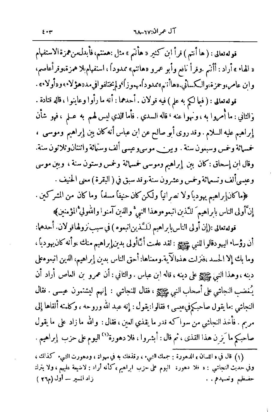 قوله تعالى إن أولى الناس بابراهيم للذين اتبعوه في سبب نزولها قولان أحدهما أن رؤساء اليهود قالوا للنبي صلى الله عليه و سلم لقد علمت أنا أولى بدين إبراهيم منك و أنه كان يهوديا وما بك إلا الحسد فنزلت هذه الآية ومعناها أحق الناس بدين إبراهيم الذين اتبعوه على دينه وهذا النبي صلى الله عليه و سلم على دينه قاله ابن عباس والثاني أن عمرو بن العاص أراد أن يغضب النجاشي على أصحاب النبي صلى الله عليه و سلم فقال للنجاشي إنهم ليشتمون عيسى فقال النجاشي ما يقول صاحبكم في عيسى فقالوا يقول إنه عبد الله وروحه وكلمته ألقاها إلى مريم فأخذ النجاشي من سواكه قدر ما يقذي العين فقال والله ما زاد على ما يقول صاحبكم ما يزن هذا القذى ثم قال أبشروا فلا دهورة اليوم على حزب إبراهيم
