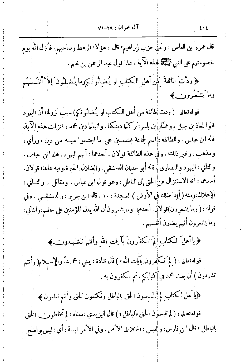 قوله تعالى ودت طائفة من أهل الكتاب لو يضلونكم سبب نزولها أن اليهود قالوا لمعاذ بن جبل وعمار بن ياسر تركتما دينكما واتبعتما دين محمد فنزلت هذه الآية قاله ابن عباس والطائفة اسم لجماعة مجتمعين على ما اجتمعوا عليه من دين ورأي ومذهب وغير ذلك و في هذه الطائفة قولان أحدهما انهم اليهود قاله ابن عباس والثاني اليهود والنصارى قاله أبو سليمان الدمشقي والضلال الحيرة وفيه هاهنا قولان أحدهما أنه الاستنزال عن الحق إلى الباطل وهو قول ابن عباس و مقاتل والثاني الإهلاك ومنه أإذا ضللنا في الأرض السجدة 10 قاله ابن جرير والدمشقي وفي قوله وما يشعرون قولان أحدهما وما يشعرون أن الله يدل المؤمنين على حالهم والثاني وما يشعرون أنهم يضلون أنفسهم