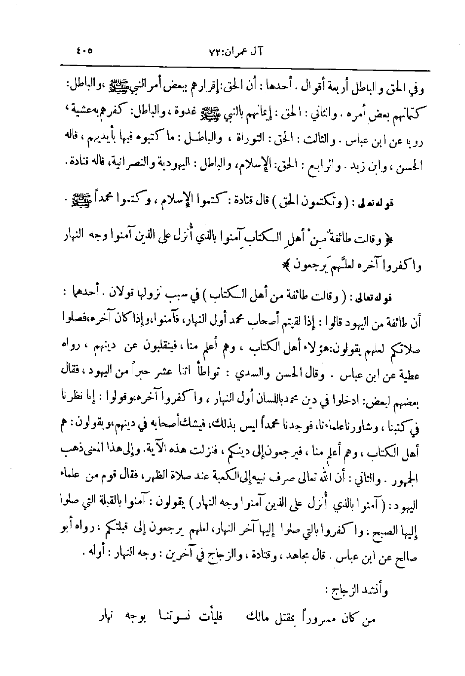 قوله تعالى وقالت طائفة من أهل الكتاب في سبب نزلوها قولان أحدهما أن طائفة من اليهود قالوا إذا لقيتم أصحاب محمد أول النهار فآمنوا و إذا كان آخره فصلوا صلاتكم لعلهم يقولون هؤلاء أهل الكتاب وهم اعلم منا فينقلبون عن دينهم رواه عطية عن ابن عباس وقال الحسن والسدي تواطأ اثنا عشر حبرا من اليهود فقال بعضهم لبعض ادخلوا في دين محمد باللسان اول النهار واكفروا آخره وقولوا إنا نظرنا في كتبنا وشاورنا علماءنا فوجدنا محمد ليس بذلك فيشك أصحابه في دينهم ويقولون هم أهل الكتاب وهم اعلم منا فيرجعون إلى دينكم فنزلت هذه الآية و إلى هذا المعنى ذهب الجمهور والثاني أن الله تعالى صرف نبيه إلى الكعبة عند صلاة الظهر فقال قوم من علماء اليهود آمنوا بالذي أنزل على الذين آمنوا وجه النهار يقولون آمنوا بالقبلة التي صلوا إليها الصبح واكفروا بالتي صلوا إليها آخر النهار لعلهم يرجعون إلى قبلتكم رواه أبو صالح عن ابن عباس قال مجاهد وقتادة و الزجاج في آخرين وجه النهار أوله